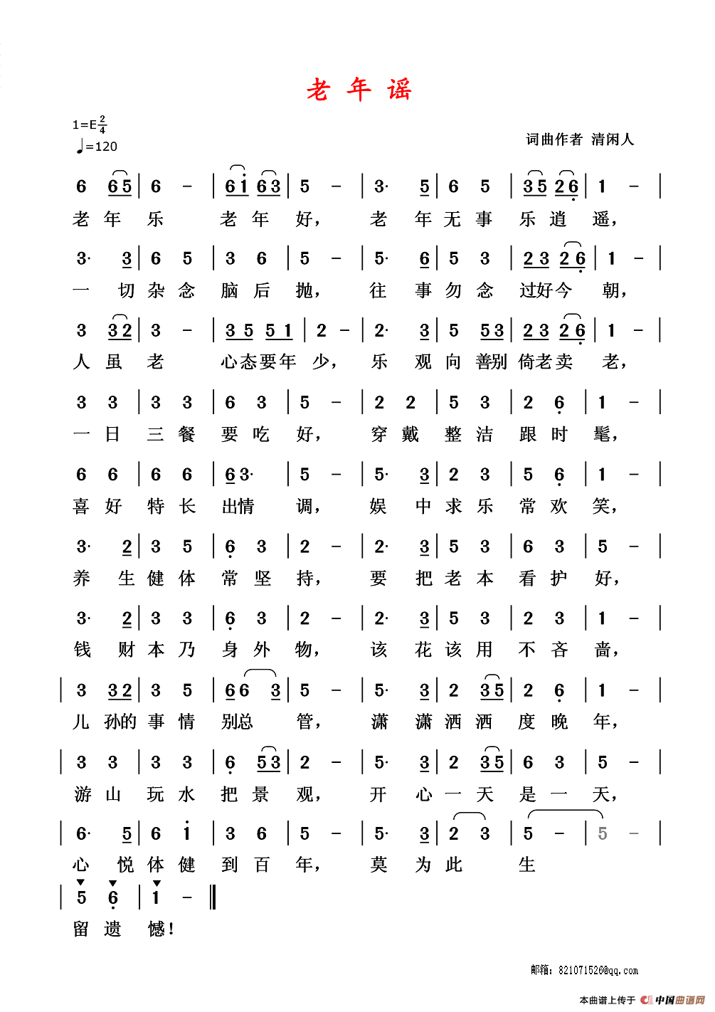 老年乐老年好,老年无事乐逍遥,一切杂念脑后抛,往事勿念过好今朝, 人虽老心态要年少,乐观向善别倚老卖老,一日三餐要吃好,穿戴整洁跟时髦,喜好特长出情调,娱中求乐常欢笑,养生健体常坚持,要把老本看护好,钱财本乃身外物,该花该用不吝啬,儿孙的事情别总管,潇潇洒洒度晚年,游山玩水把景观,开心一天是一天,心悦体健到百年,莫为此生留遗憾!