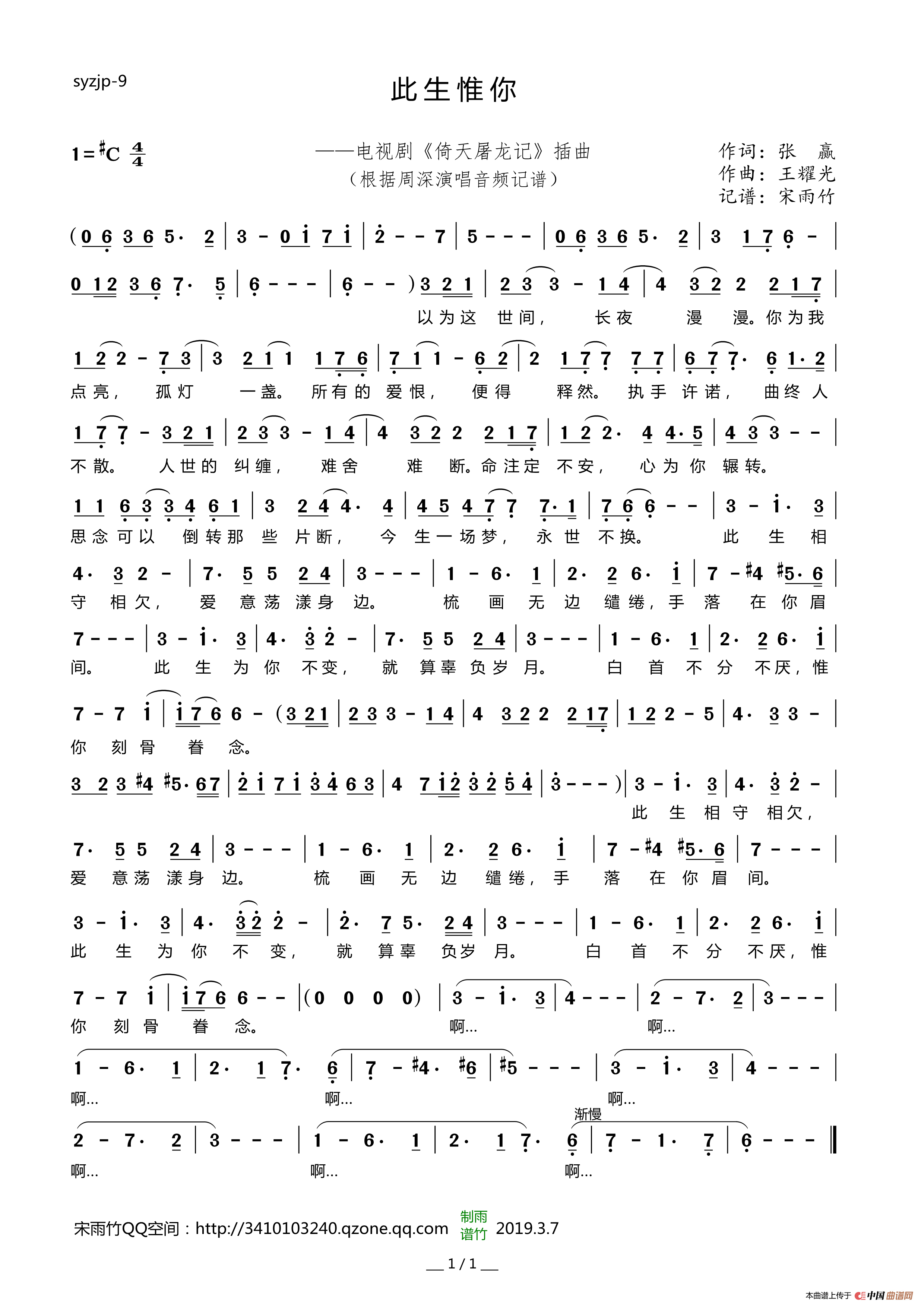 周深新发布,电视剧《倚天屠龙记》插曲,一首非常动人的歌。增传了字体放大版的简谱,内容不变。
