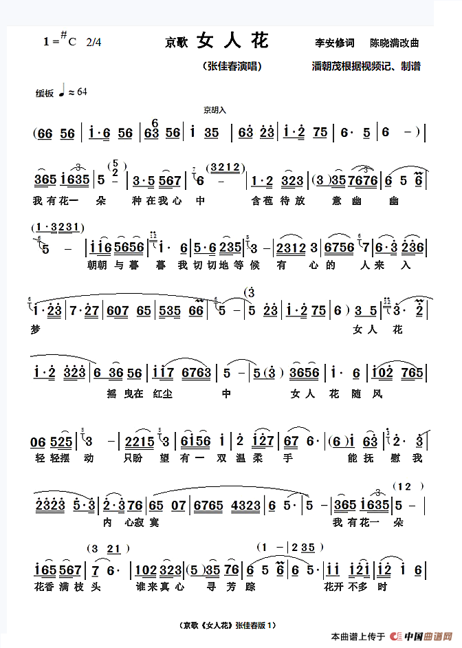 补传:京歌《女人花》张佳春演唱谱漏字(第二页第三行漏一“香”字)