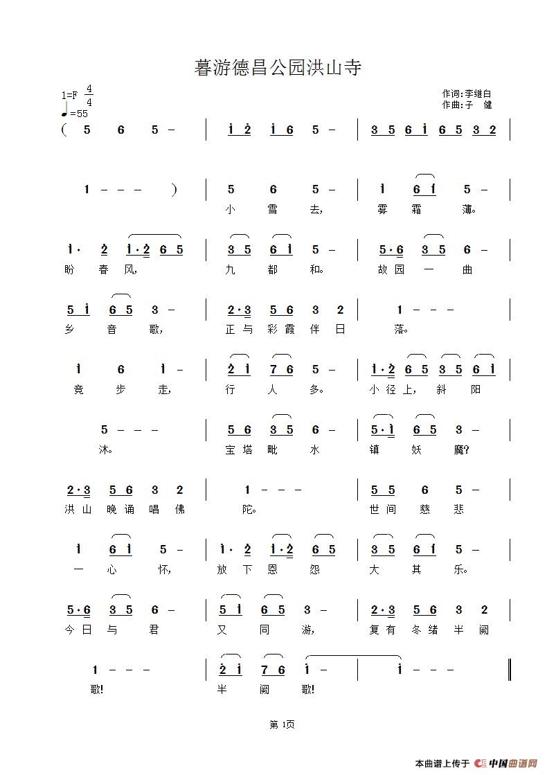 提示:在曲谱图片上单击右键,选择"图片另存为..."即可将曲谱保存到您的电脑中,打印时候可将图片插入到WORD中,调整合适大小打印即可。