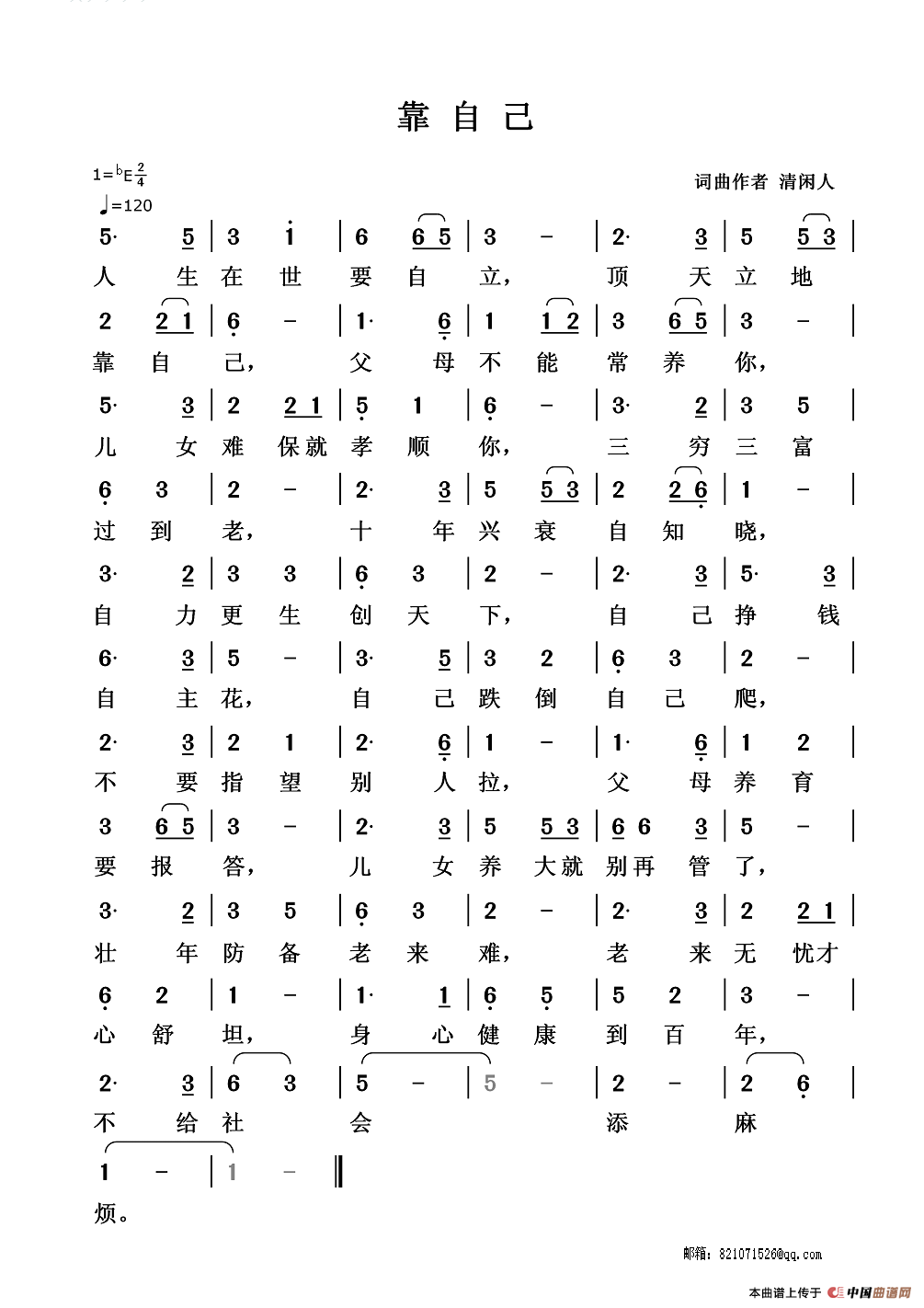 人生在世要自立,顶天立地靠自己,父母不能常养你,儿女难保就孝顺你,三穷三富过到老,十年兴衰自知晓,自力更生创天下,自己挣钱自主花,自己跌倒自己爬,不要指望别人拉,父母养育要报答,儿女养大就别再管了,壮年防备老来难,老来无忧才心舒坦,身心健康到百年,不给社会添麻烦。