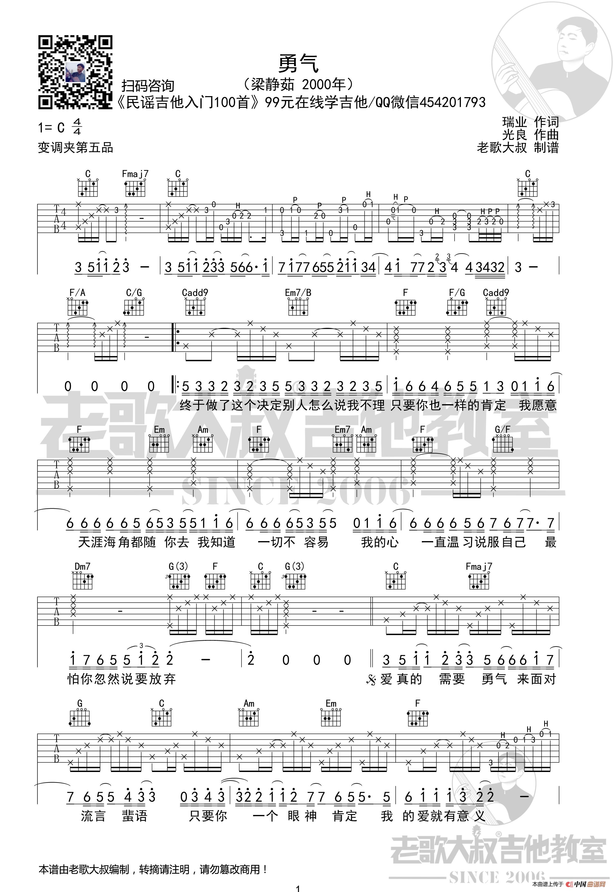 梁静茹《勇气》考级版超清谱 老歌大叔吉他教室出品