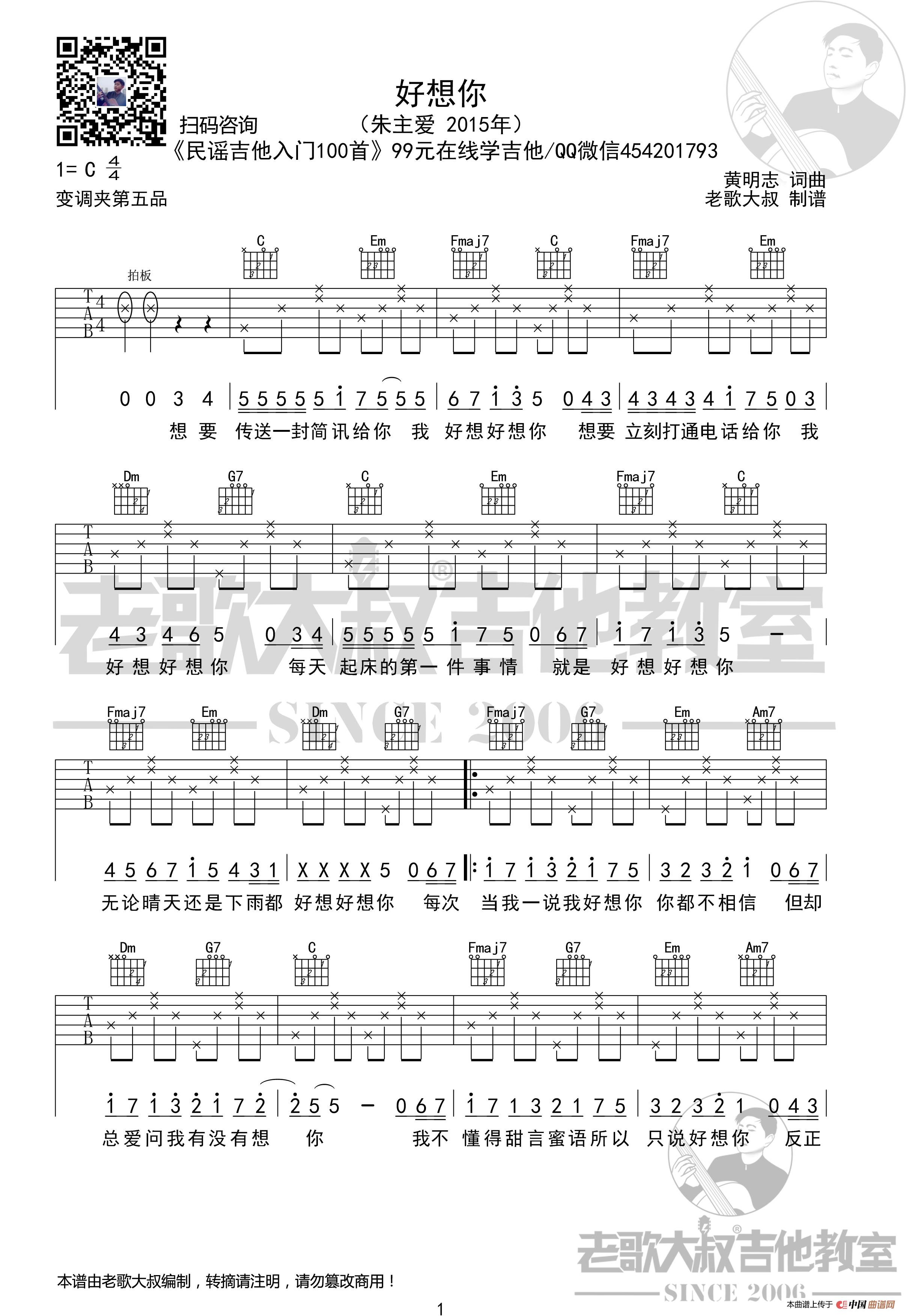 朱主爱《好想你》简化版超清谱 老歌大叔吉他教室出品