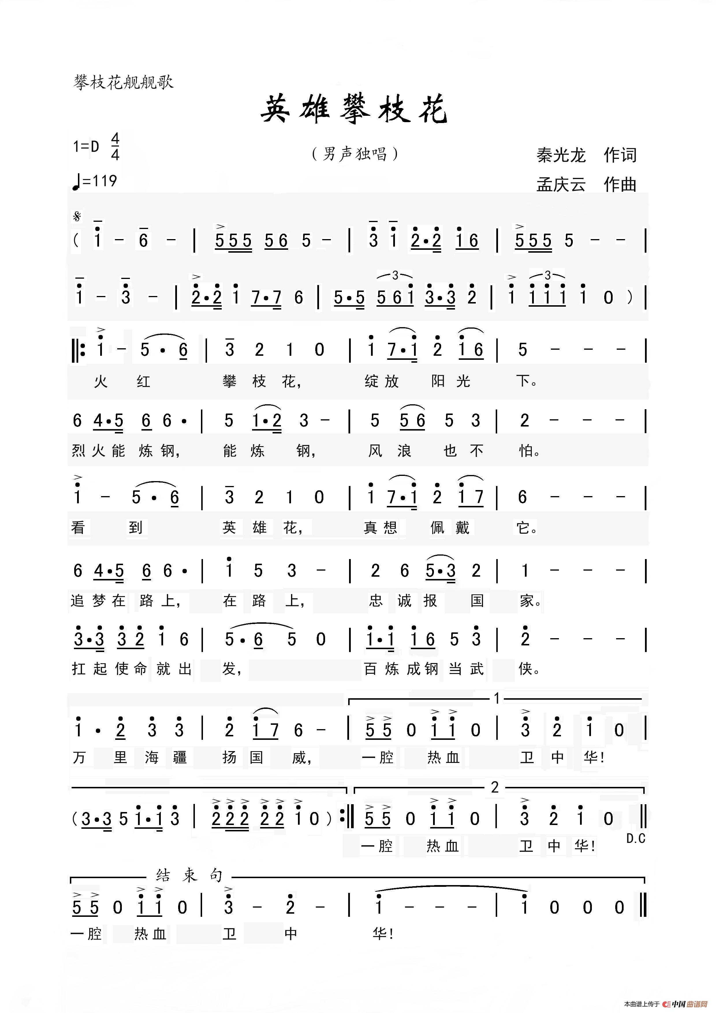 攀枝花市退役军人事务局携手词作家秦光龙和著名作曲家孟庆云、著名歌唱家刘和刚,为攀枝花舰创作的《英雄攀枝花》,开门见山突出攀枝花市特点,一以贯之铺陈火红的花朵、灿烂的阳光、炼钢的炉火、青春的热血。红花幻变为攀钢集团的炉火,与乘风破浪的军舰相联系;既有攀枝花青年报国从军的写照,又有攀枝花舰官兵肩负新时代使命任务、强化练兵备战的剪影。“武侠”指代能打仗、打胜仗的强军先锋,古为今用,生动贴切。末句寄托攀枝花人民的厚望,展示攀枝花舰官兵的壮志,有画龙点睛之功,收大气磅礴之效。歌曲优美、雄壮,既巧妙表现军民融合及鱼水深情,又生动塑造铁骨铮铮的英雄形象,展现热血澎湃的报国情怀。