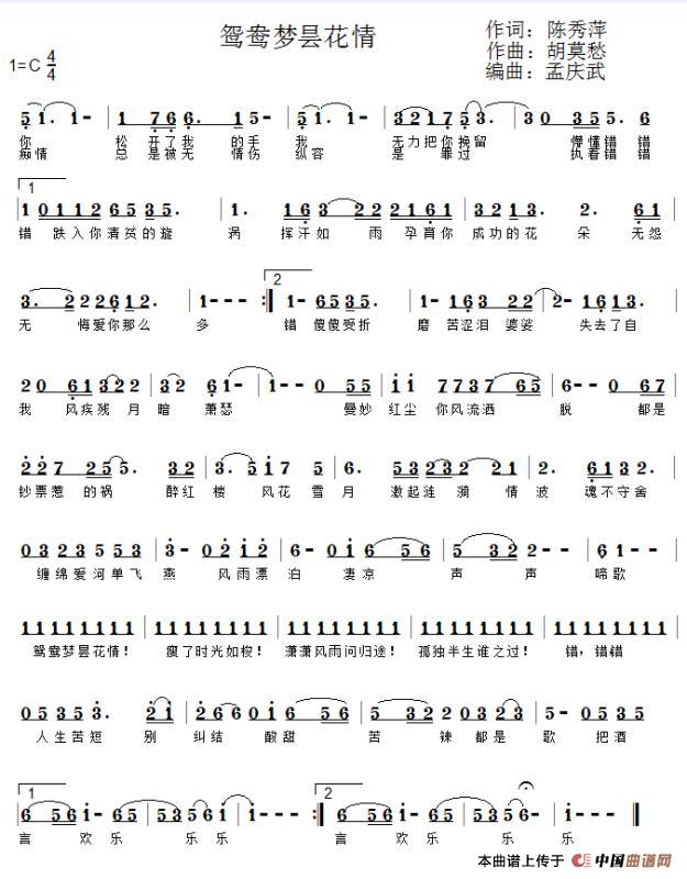 鸳鸯梦昙花情 作词:陈秀萍 作曲:胡莫愁 编曲:梦庆武 你松开我的手 我无力把你挽留 懵懂错!错!错! 跌入你清贫的漩涡 挥汗如雨 孕育你成功的花朵 无怨无悔爱你那么多 痴情总被无情伤 纵容是罪过 执着错!错!错! 傻傻受折磨 苦涩泪婆娑 失去了自我 风疾残月暗萧瑟 曼妙红尘你风流洒脱 都是钞票惹的祸 醉红楼风花雪月 激起涟漪情波 魂不守舍缠绵爱河 单飞燕风雨漂泊 凄凉声声啼歌 鸳鸯梦昙花情 瘦了时光如梭 潇潇风雨问归途 孤独半生缘绝 错,错,错 人生苦短 别彷徨 别纠结 酸甜苦辣都是歌 把酒言欢 乐,乐,乐关于《鸳鸯梦昙花情》曲谱的评论