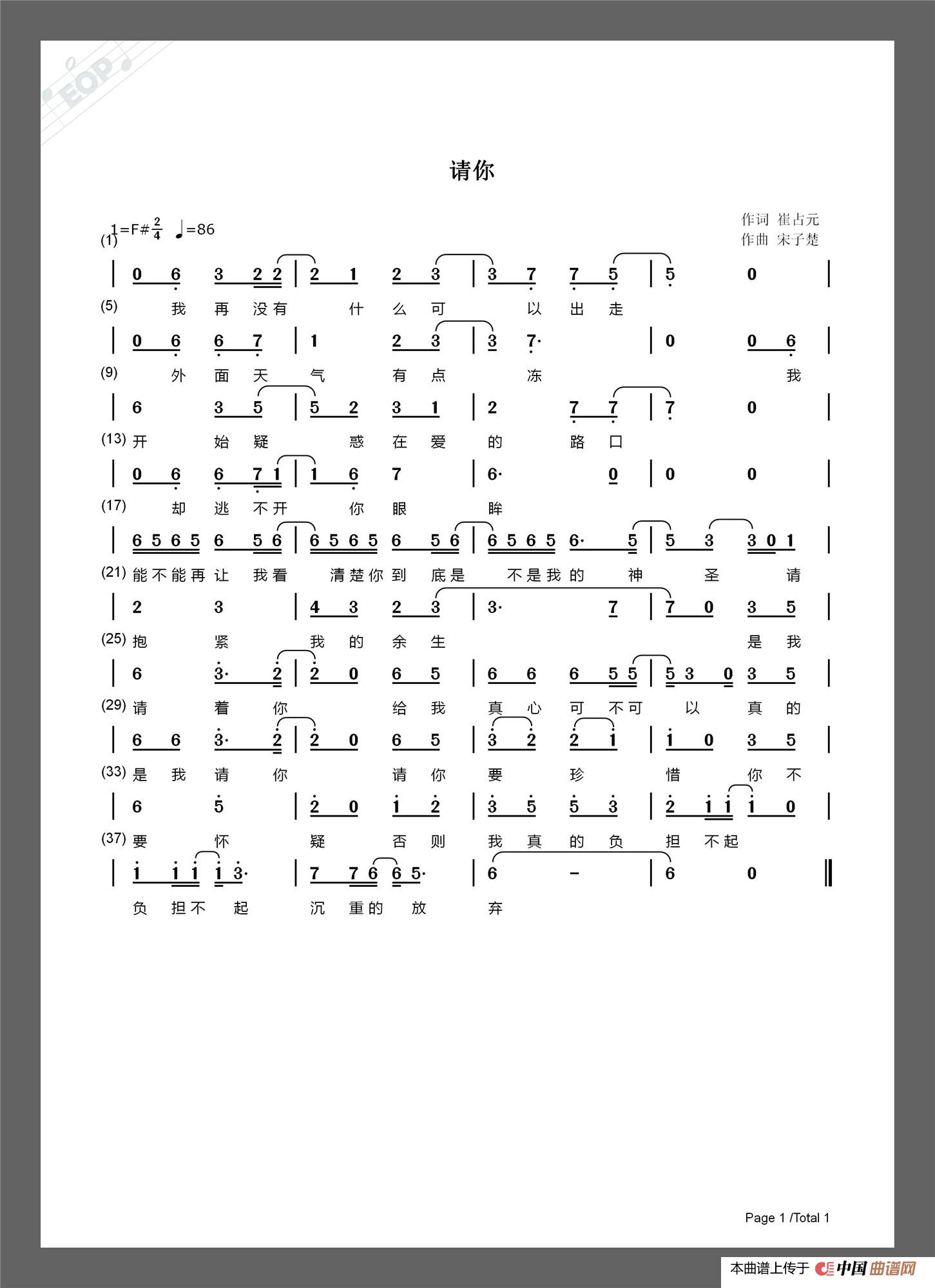 提示:在曲谱图片上单击右键,选择“图片另存为...”即可将曲谱保存到您的电脑中,打印时候可将图片插入到WORD中,调整合适大小打印即可。