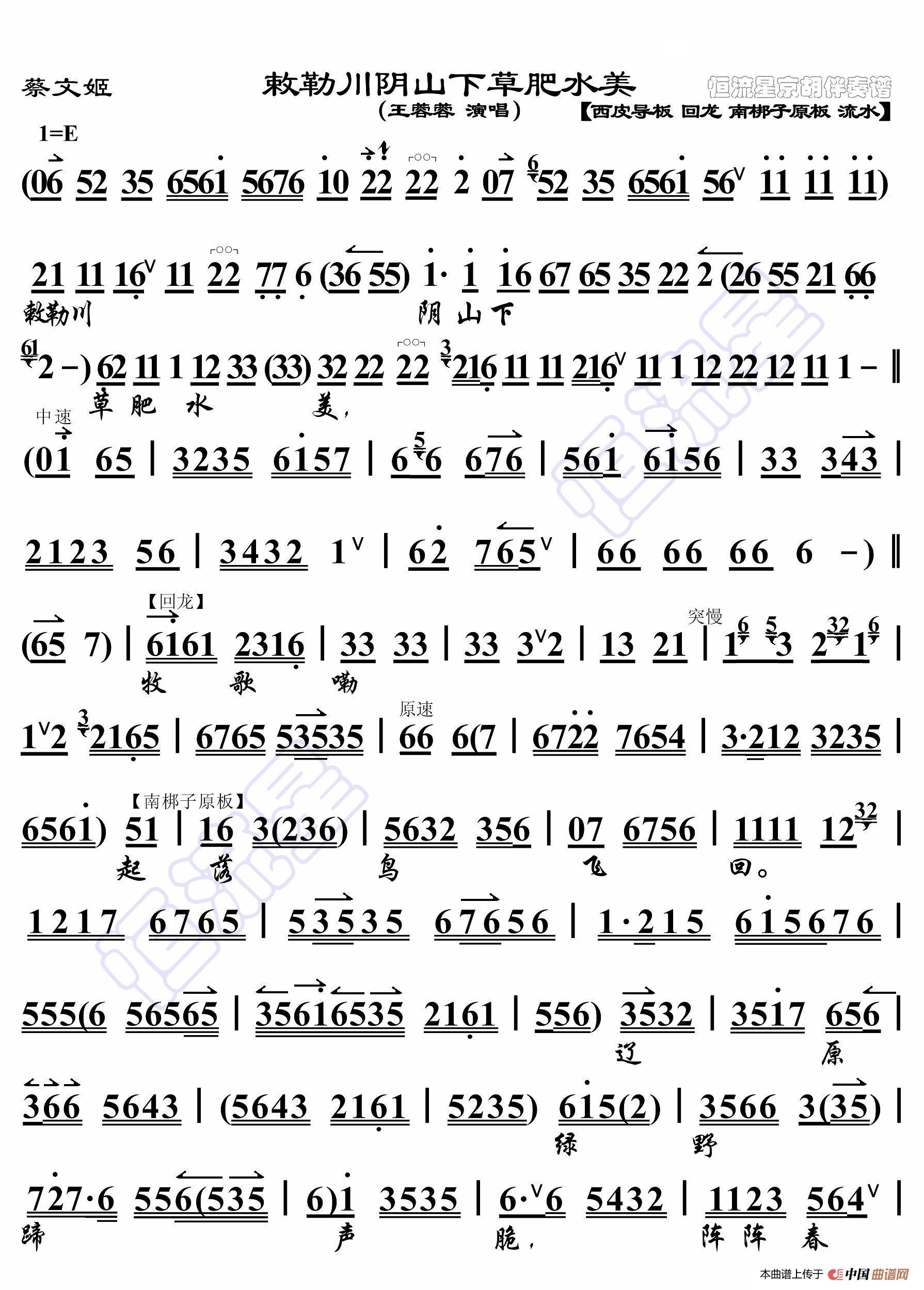 蔡文姬·敕勒川阴山下草肥水美(京胡伴奏谱)