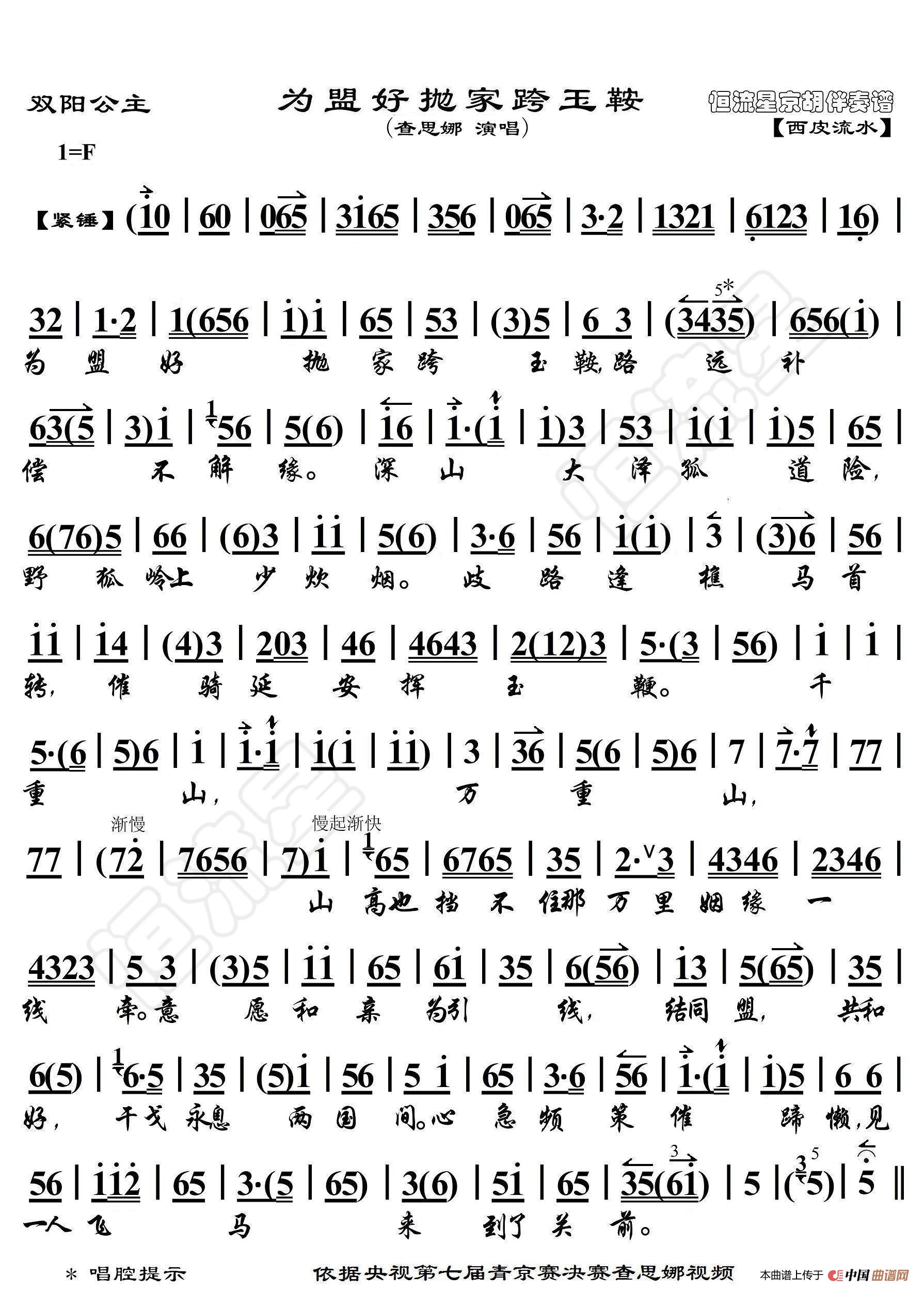 双阳公主·为盟好抛家跨玉鞍(京胡伴奏谱)