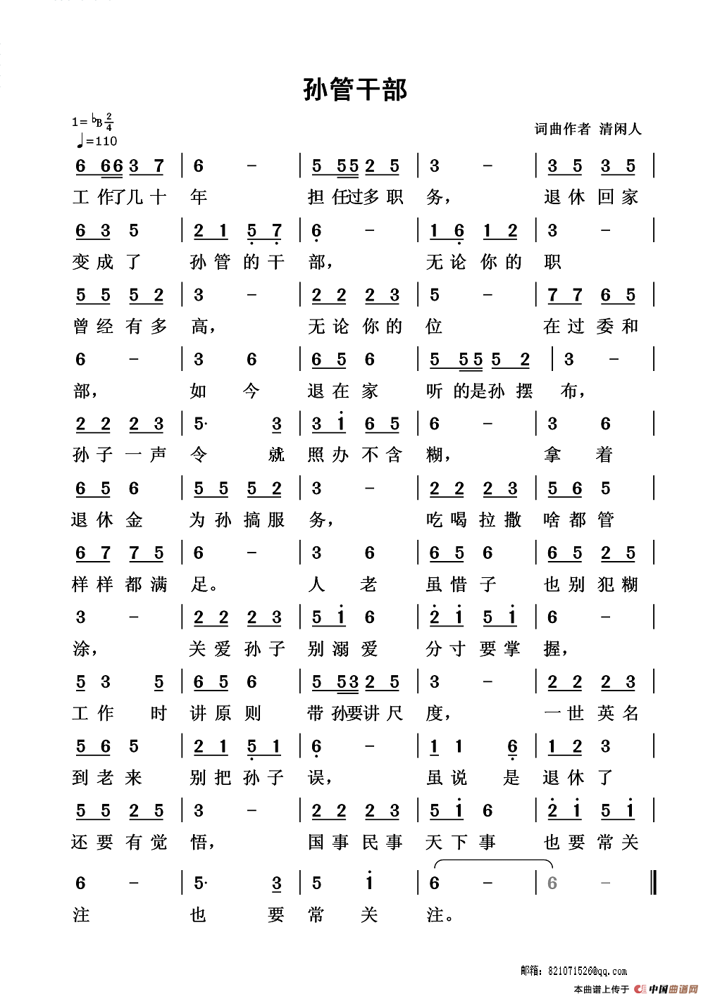 工作了几十年担任过多职务,退休回家变成了孙管的干部,无论你的职曾经有多高,无论你的位在过委和部,如今退到家听的是孙摆布,孙子一声令就照办不含糊,拿着退休金为孙搞服务,吃喝拉撒啥都管样样都满足。人老虽惜子也别犯糊涂,关爱孙子别溺爱分寸要掌握,工作时讲原则带孙要讲尺度,一世英名到老来别把孙子误,虽说是退休了还要有觉悟,国事民事天下事也要常关注。