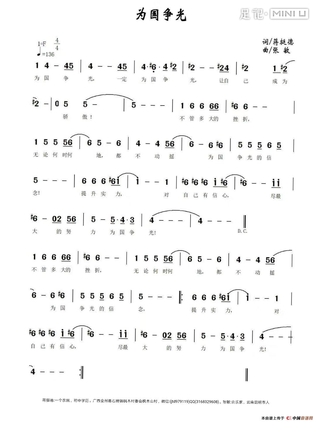 为国争光,一定为国争光,让自己成为骄傲。不管多大的挫折,无论何时何地,都不动摇为国争光的信念。提升实力,对自己有信心,尽最大的努力,为国争光!l关于《为国争光》曲谱的评论