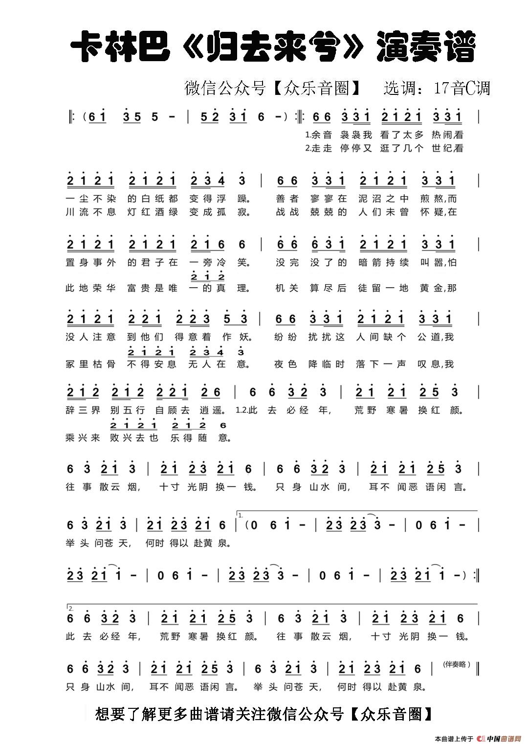 归去来兮(拇指琴卡林巴琴单音简谱)