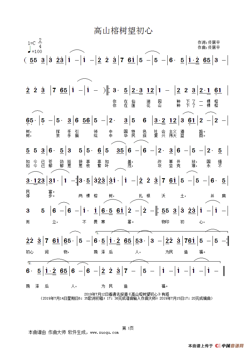 2019年7月14日17:38完成主旋律谱曲,用作曲大师输出简谱;