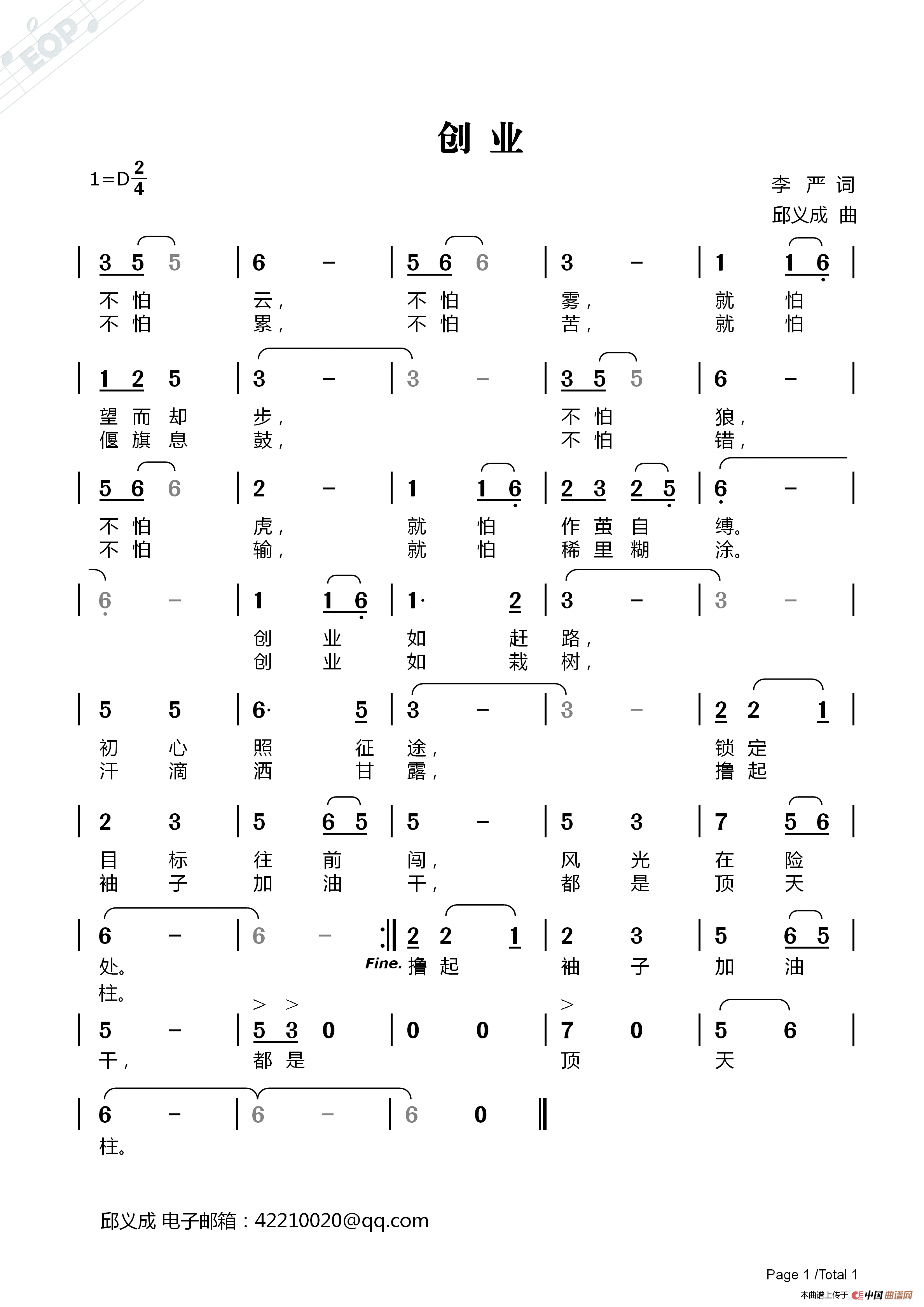 关于《创业》曲谱的评论