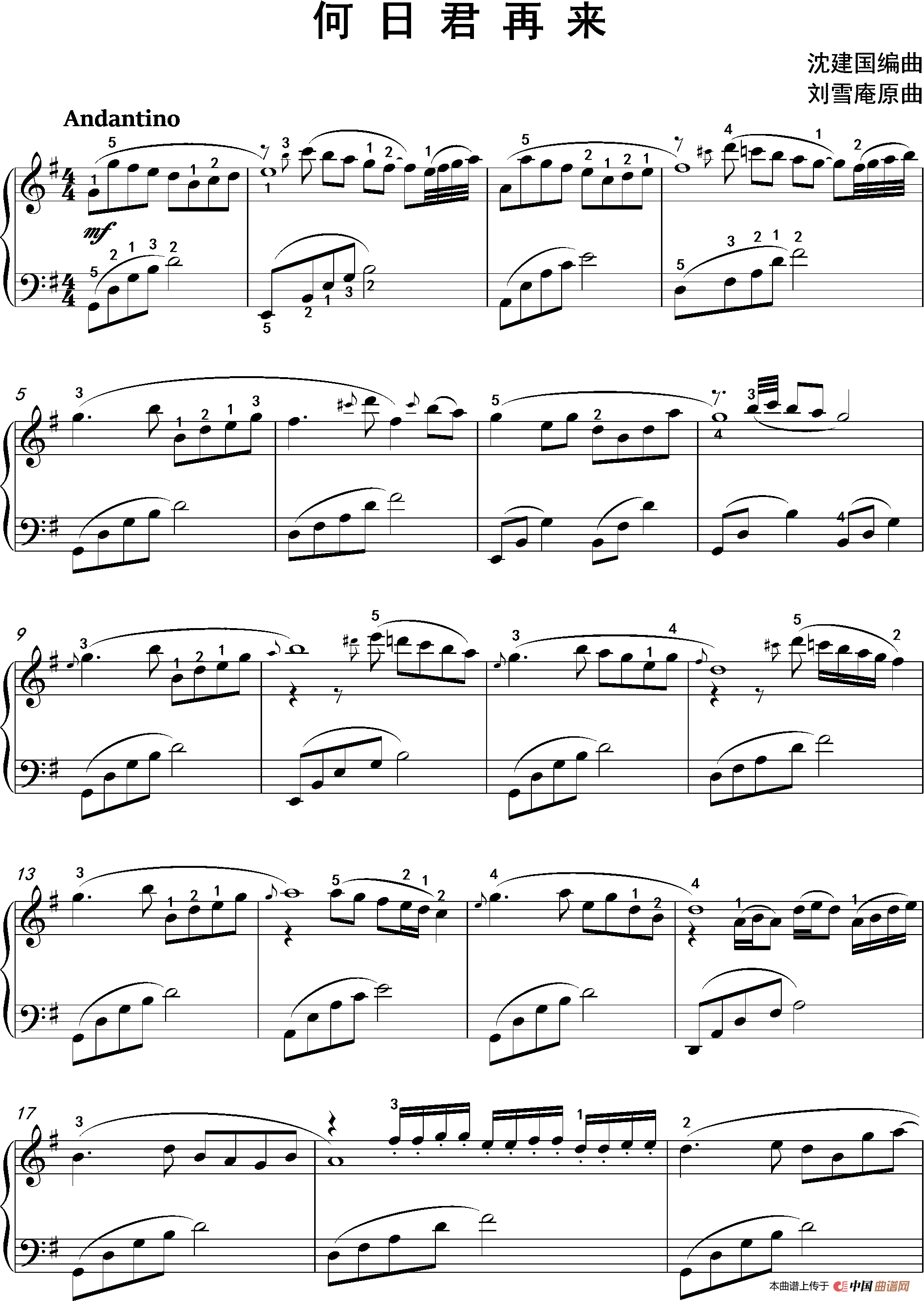 根据中国近代史上最受欢迎的经典同名歌曲《何日君再来》而改编的钢琴曲。难易程度相当于5级。