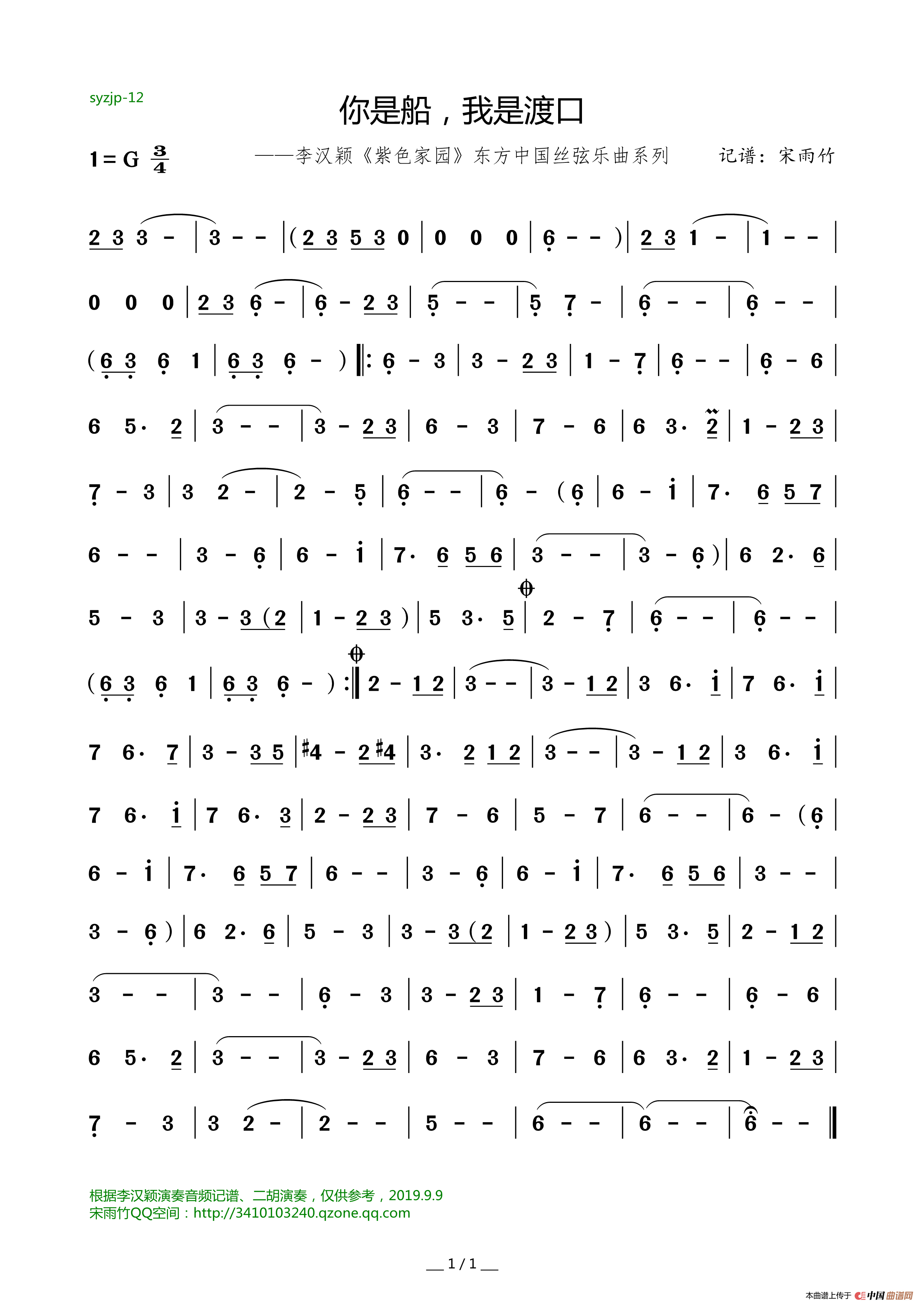 此曲为纯音乐,系李汉颖《紫色家园》东方中国丝弦乐曲系列之一,原调G。旋律清幽宁静,伤而不悲,引人入境。宋雨竹二胡演奏(#F调)。