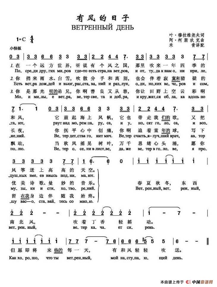 有风的日子ВЕТРЕННЫЙ ДЕНЬ(中俄简谱)