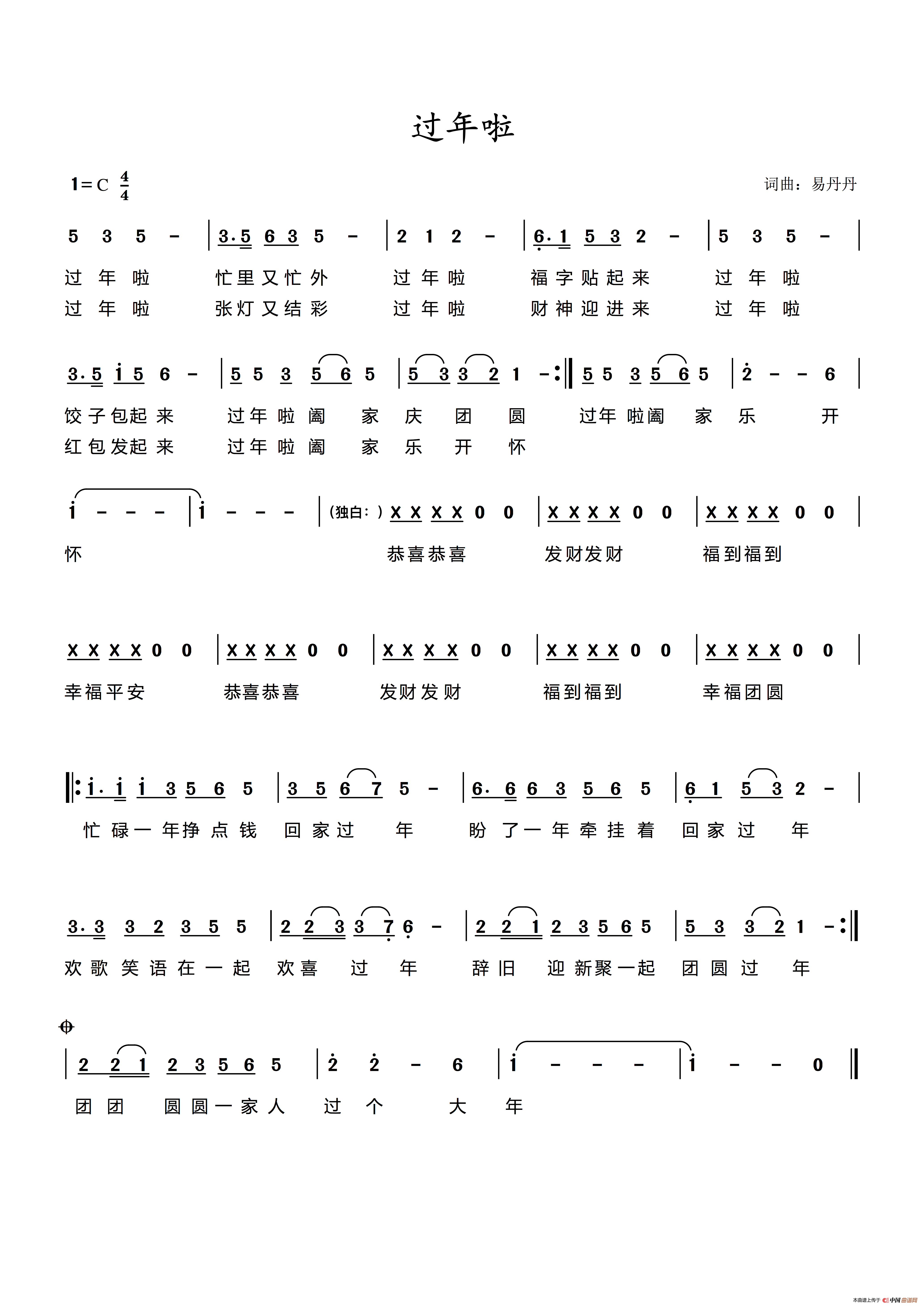 过年,是中国最隆重、最热闹的传统节日,它承载了中国人最热烈的情感和美好寄望。易丹丹笔下的《过年啦》,歌词通俗易懂,看似简单但寓意深厚。A、B、C(主歌、独白、副歌)三段式的作曲创意,让过年的热闹、喜庆、幸福、团圆等画面栩栩如生并一一呈现。