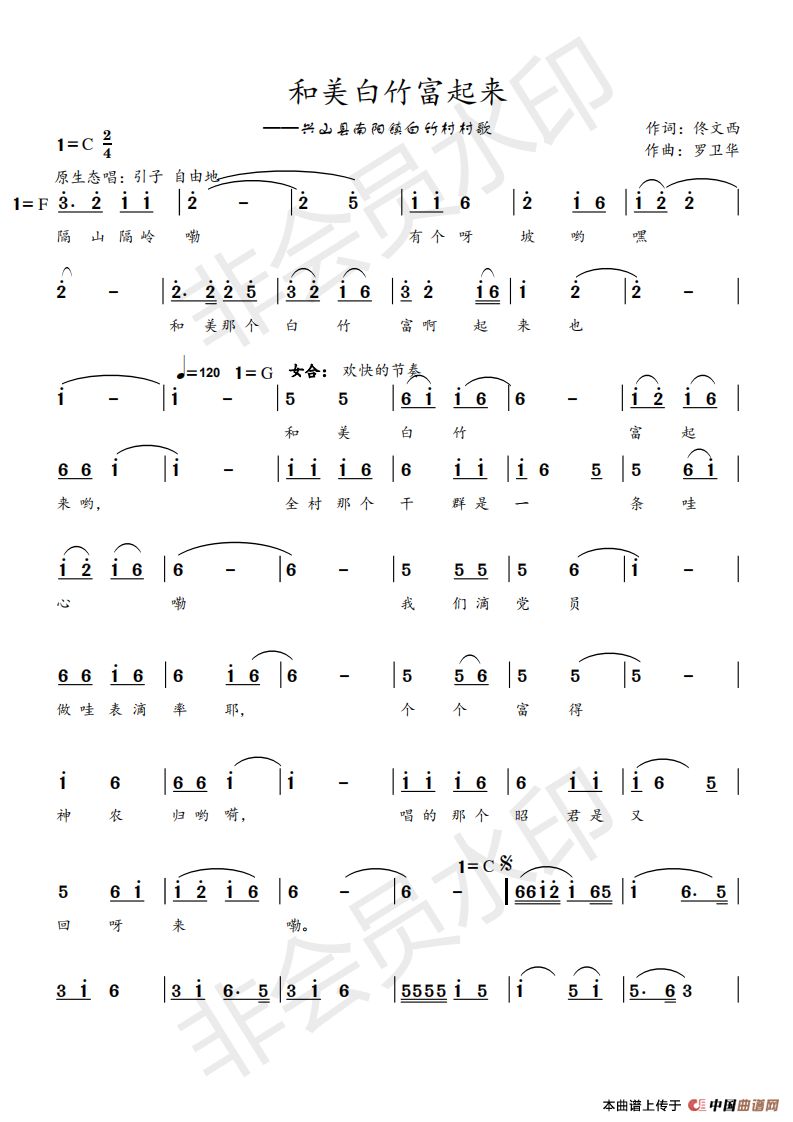 生活是创作的源泉,词曲作家通过亲身的感受、感悟,几易其稿,精心打磨,并结合兴山《三音歌》、《五句子歌不为难》的音乐元素进行创作,间奏编曲融入了南阳镇的《薅草锣鼓》的打击乐节奏型、白竹的渔鼓调的演唱形式及音乐文化元素,歌曲由男女领唱、合唱、轮唱、体现了新时代新农村新精神新风貌新变化的精气神,展现白竹村人民群众生活的幸福感,撸起袖子加油干的气魄和精神。创作出这首被白竹村人喜爱的《和美白竹富起来》的新村歌,将会为繁荣中国乡村音乐文化作出新的贡献。