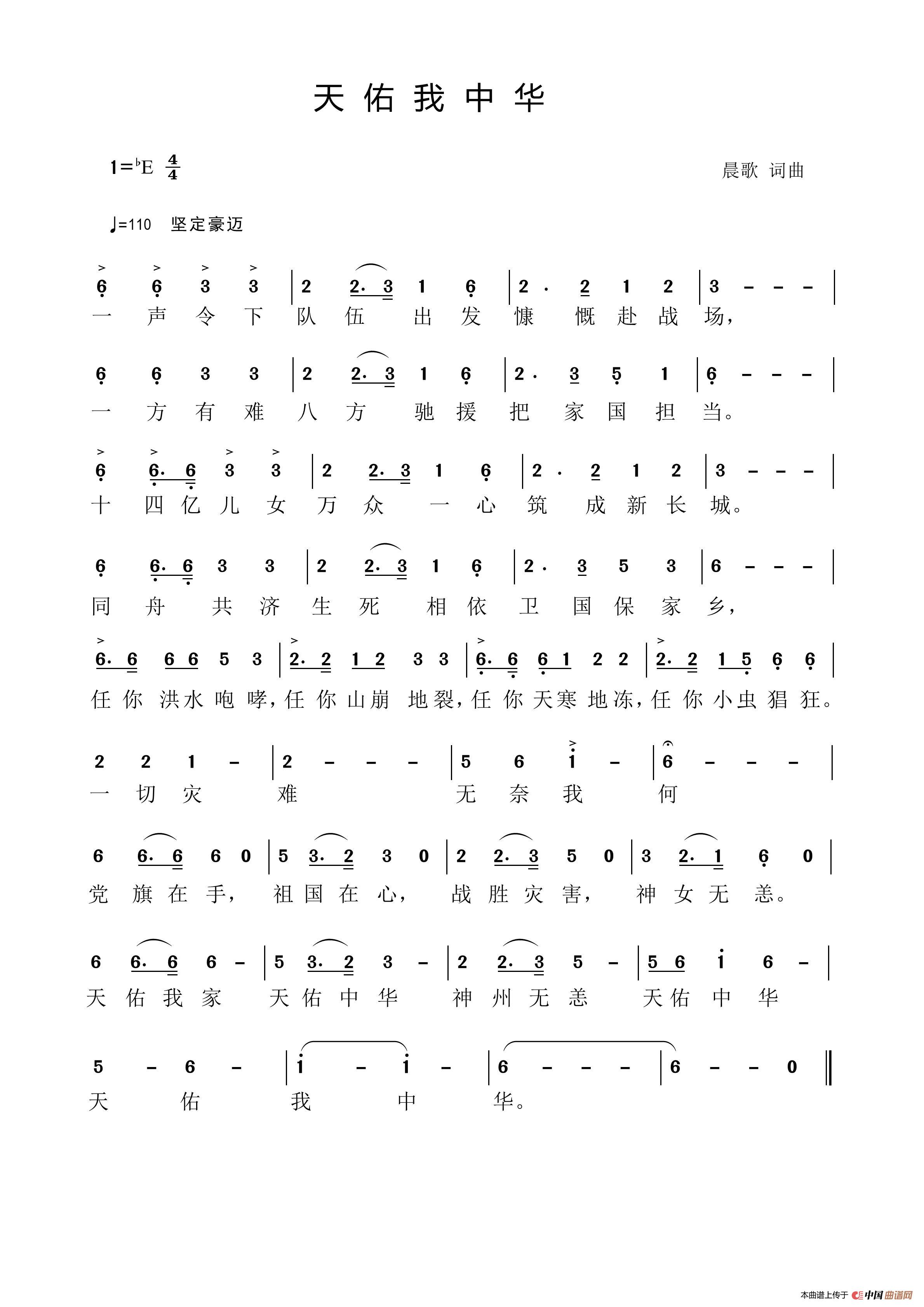 一声号令队伍出发慷慨赴战场,一方有难八方驰援把家国担当。14亿儿女万众一心筑成新长城,同舟共济众志成城卫国保家乡。任你洪水咆哮,任你天崩地裂,任你天寒地冻,任你小虫猖狂。一切灾难,无奈我何!党旗在手,祖国在心,战胜灾害,神女无恙。天佑我家,天佑中华。神州无恙,天佑中华,天佑我中华。