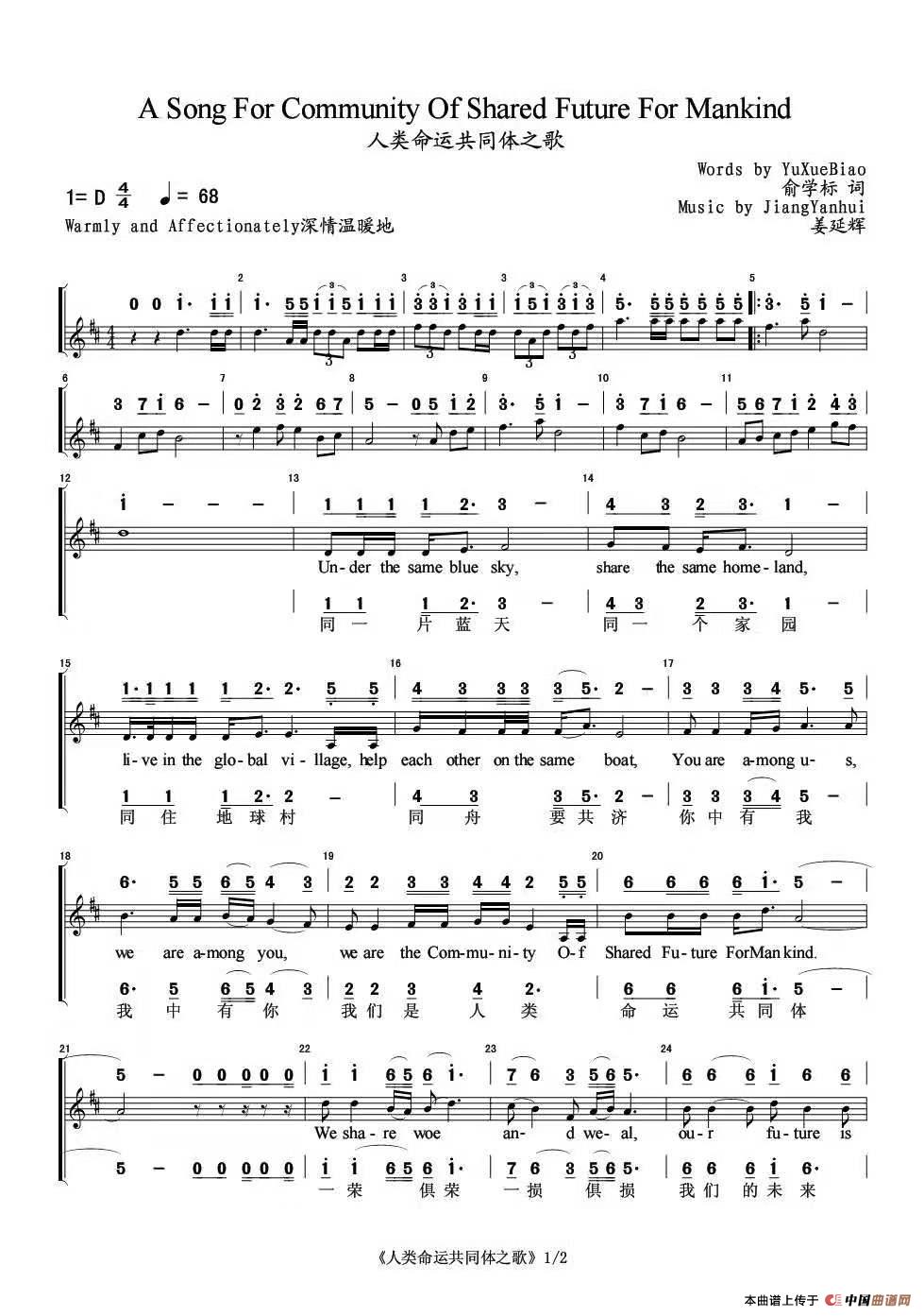 《人类命运共同体之歌》(新国际歌)俞学标词 姜延辉曲 美jiesen演唱 同一片蓝天 同一个家园 同住地球村 同舟要共济 你中有我 我中有你 我们是人类命运共同体 一荣俱荣 一损俱损 我们的未来紧密联系在一起 地不分远近 种族无高低 国不分大小 平等不相欺 呕 我们是一家 真诚好兄弟 合作要共赢 友谊要珍惜 和平发展 共同繁荣 世界将会更加温馨 更加美丽 更加美丽。关于《人类命运共同体之歌》曲谱的评论