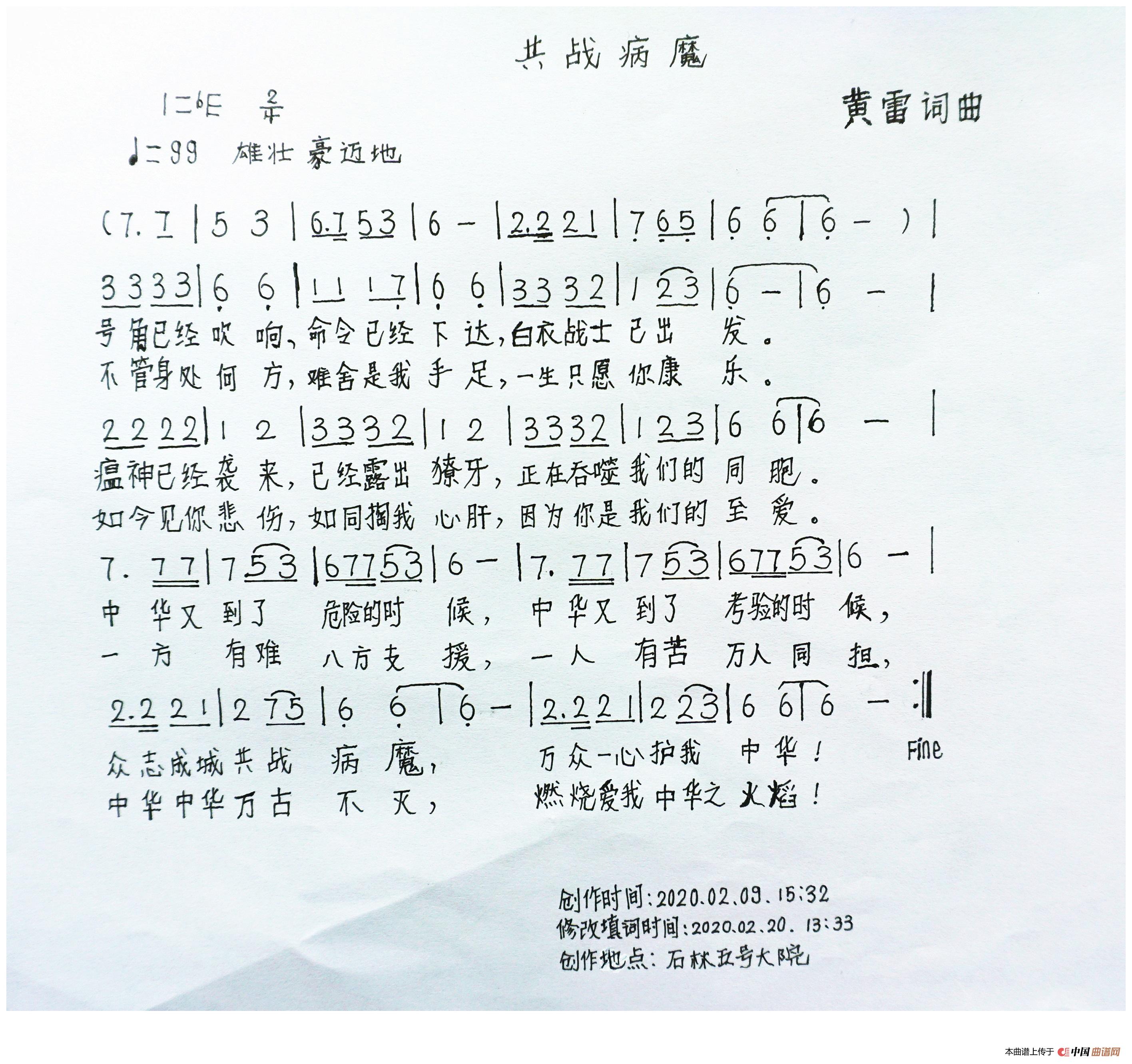 2020年2月9日我创作《共战病魔》歌曲时,首先是突有旋律在脑中铿锵回荡,我马上随口哼唱旋律音符,感觉旋律衔接很顺畅,具有进行曲的风格,可以调动起我勇往直前夺取胜利的一种情绪。旋律部分可以说是一气呵成,但歌词创作很煎熬,当天我只有填写出第1段歌词,没有思路引出第2段歌词。一直到事后第12天我又有填词思路才创作出第2段歌词!2首作品之中,我比较偏爱《共战病魔》。 [回复]