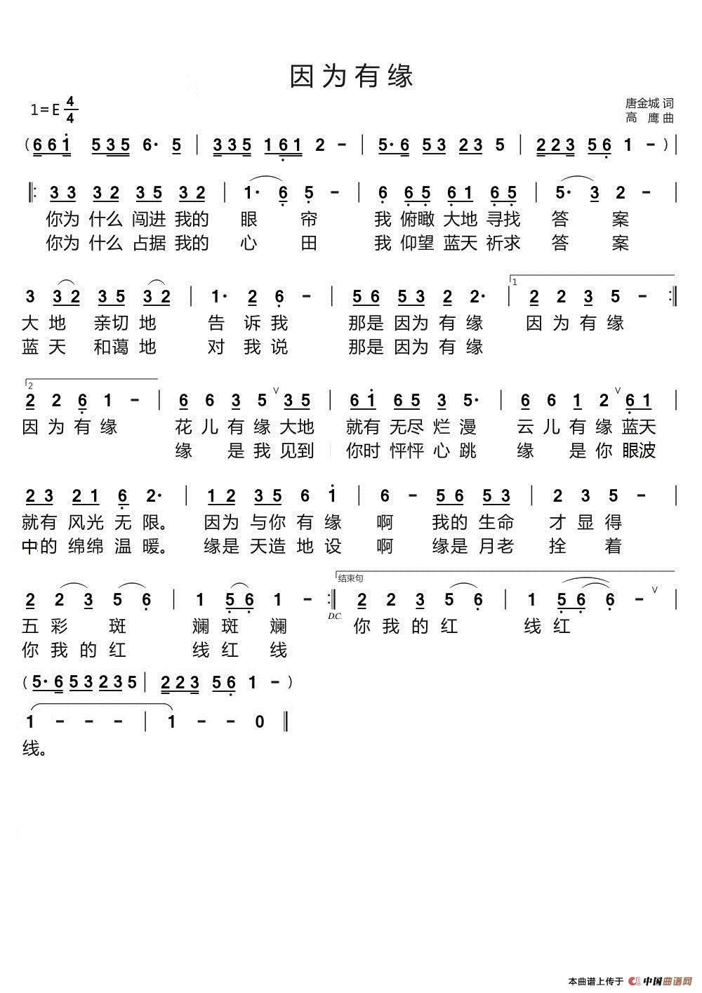 关于《因为有缘》曲谱的评论