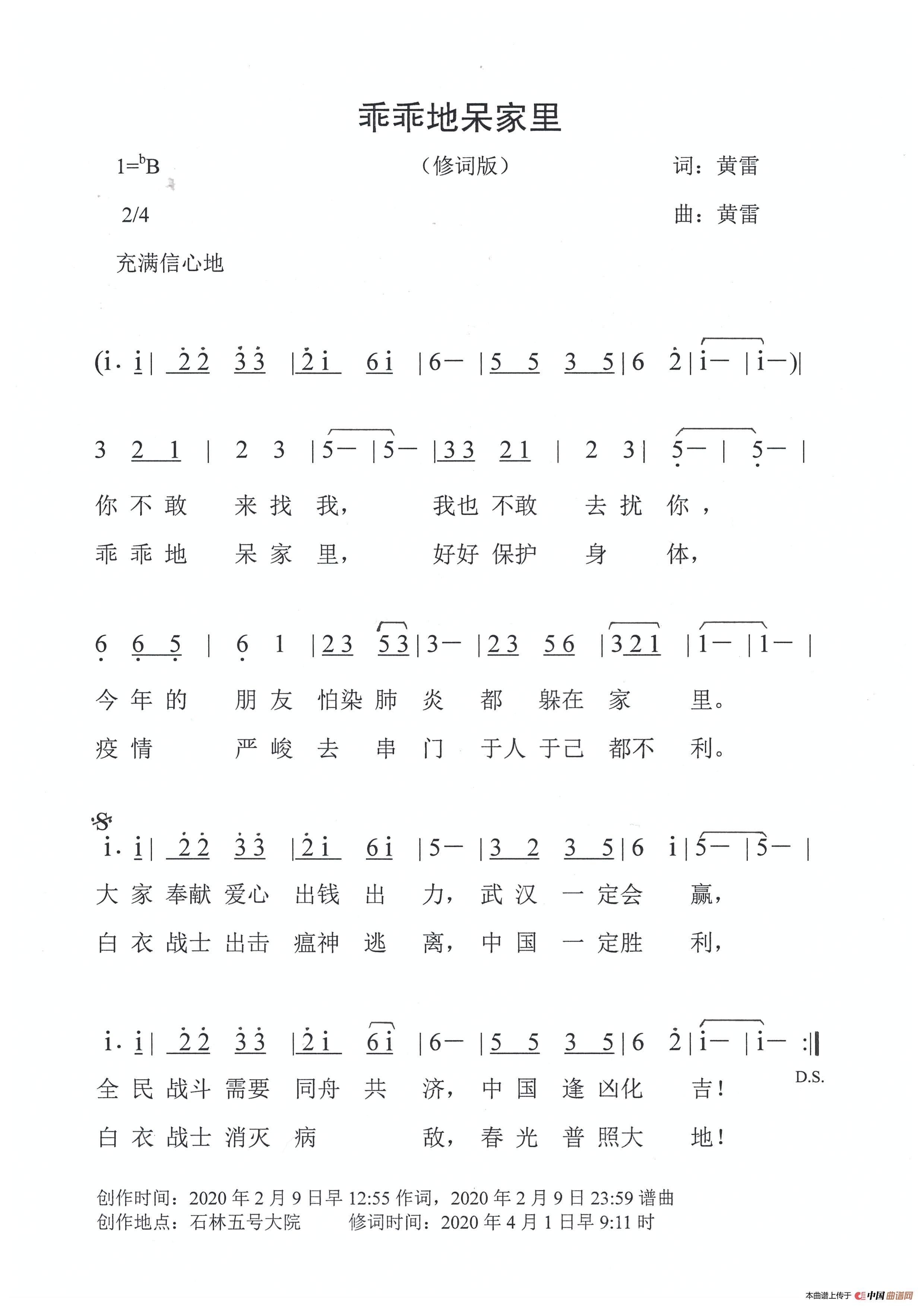 《乖乖地呆家里》改词发表说明:为弥补该原创作品歌词局部不符合韵律规范之遗憾,从而接受自我挑战再次投入创作去修改完善歌词部分,以对得起歌迷朋友和自己的爱乐之心!经过艰苦努力现已完成修改。今天借贵网络平台发布我的抗疫歌曲作品《乖乖地呆家里(修词版)》。谨以此歌向武汉抗疫英烈致敬!向死难同胞致哀! [回复]