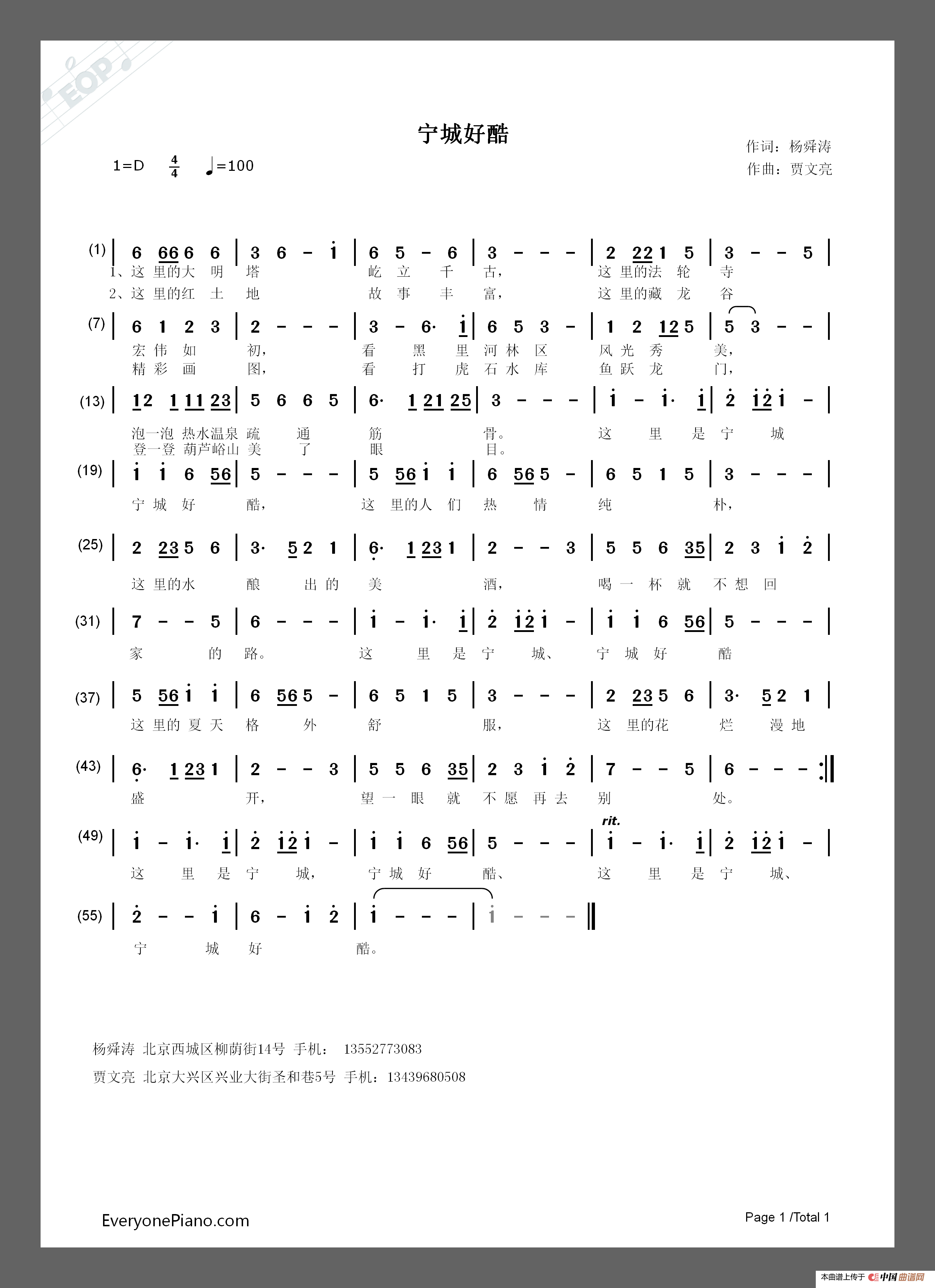 关于《宁城好酷》曲谱的评论
