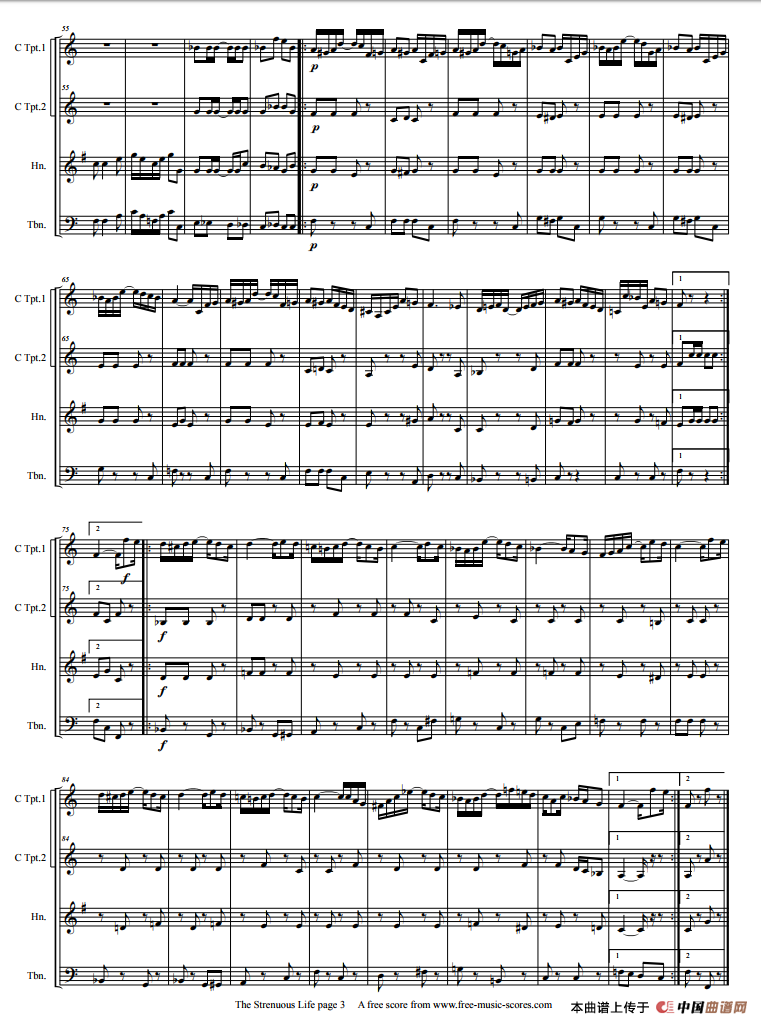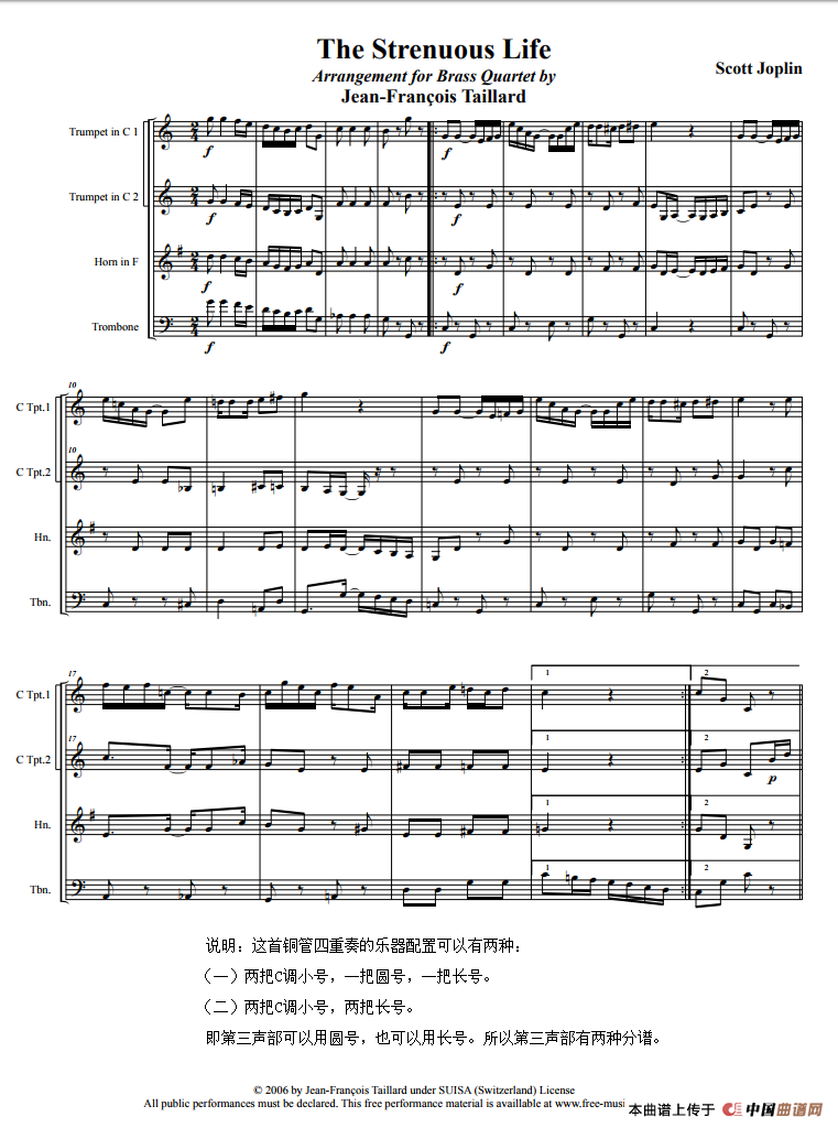 斯考特·乔普林(SCOTT JOPLIN)(1868一1917),美国黑人作曲家、钢琴家。以其拉格泰姆作品闻名。被后世誉为“拉格泰姆之王”。本曲是铜管四重奏,可用两把C调小号一把圆号一把长号演奏,也可以用两把C调小号两把长号演奏。第三声部有圆号和长号两种分谱,可根据情况选用。