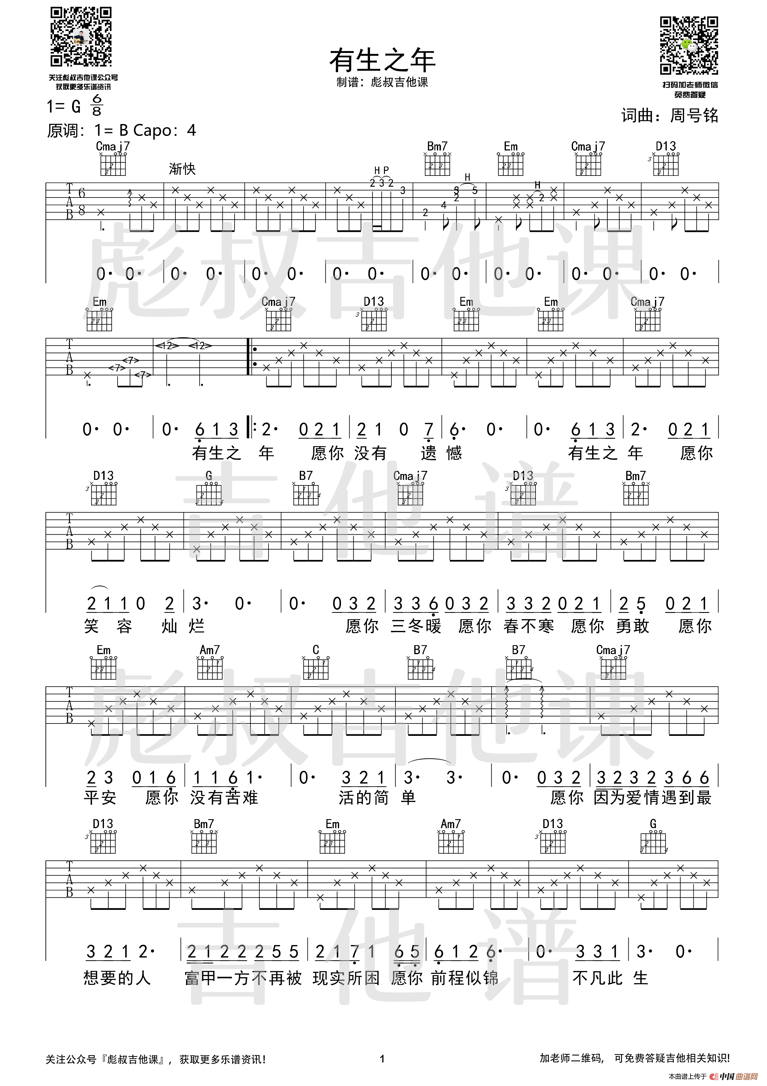 孟梓—《有生之年》G调弹唱六线谱(彪叔吉他课制谱)