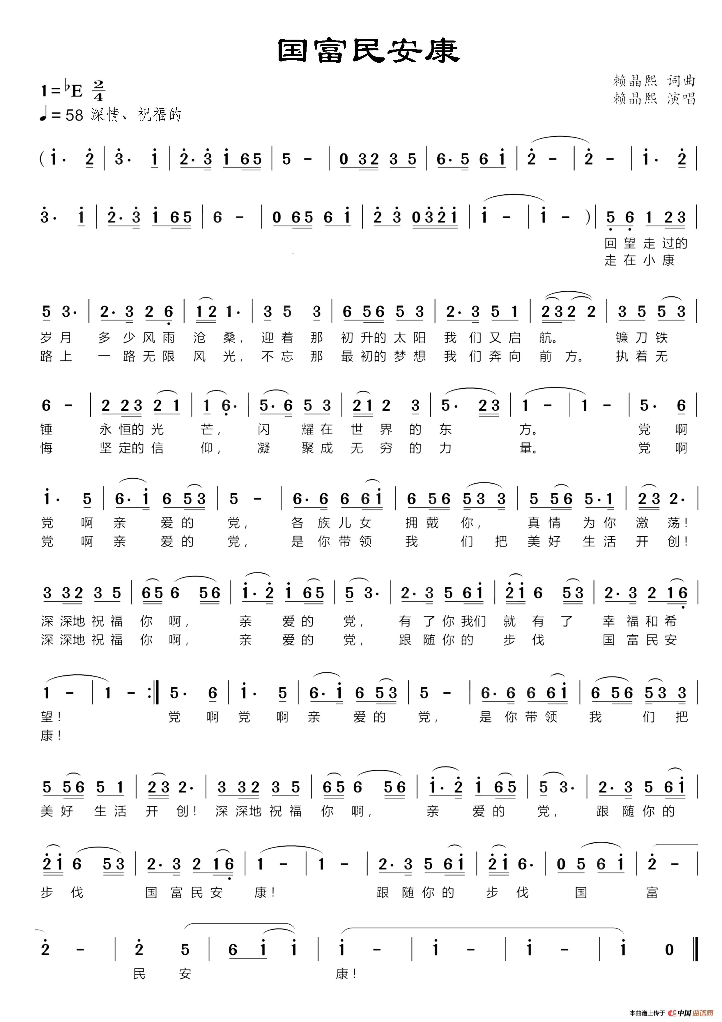 歌曲《国富民安康》是由青年男中音歌唱家赖晶熙作词、作曲、编曲、演唱的献礼七一的作品,创作于全面建成小康社会决胜之年(2020年)。