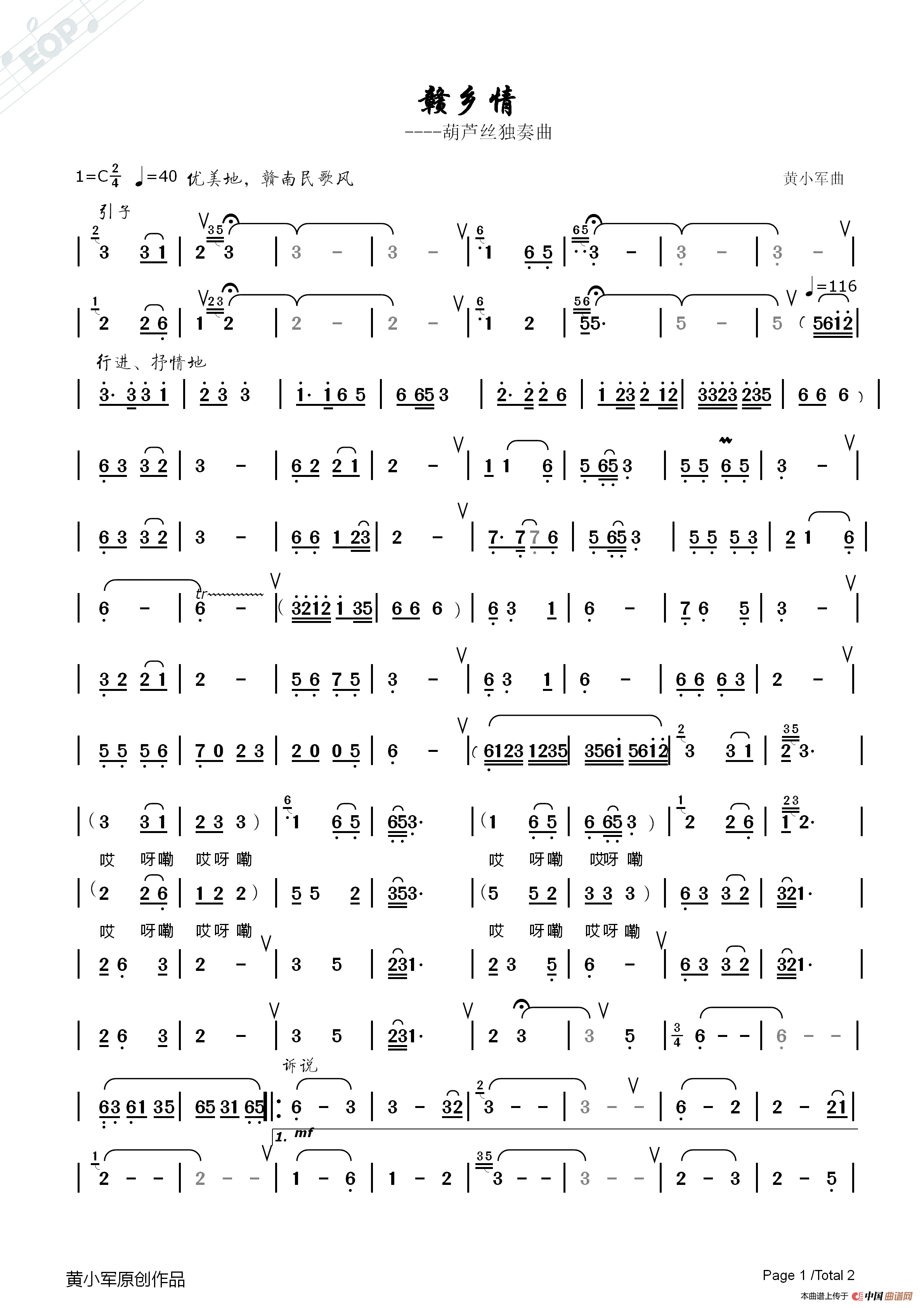 提示:在曲谱图片上单击右键,选择“图片另存为...”即可将曲谱保存到您的电脑中,打印时候可将图片插入到WORD中,调整合适大小打印即可。