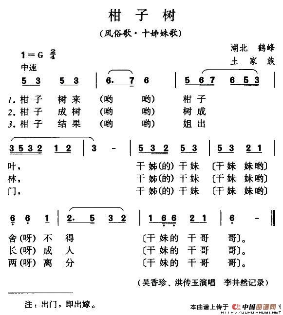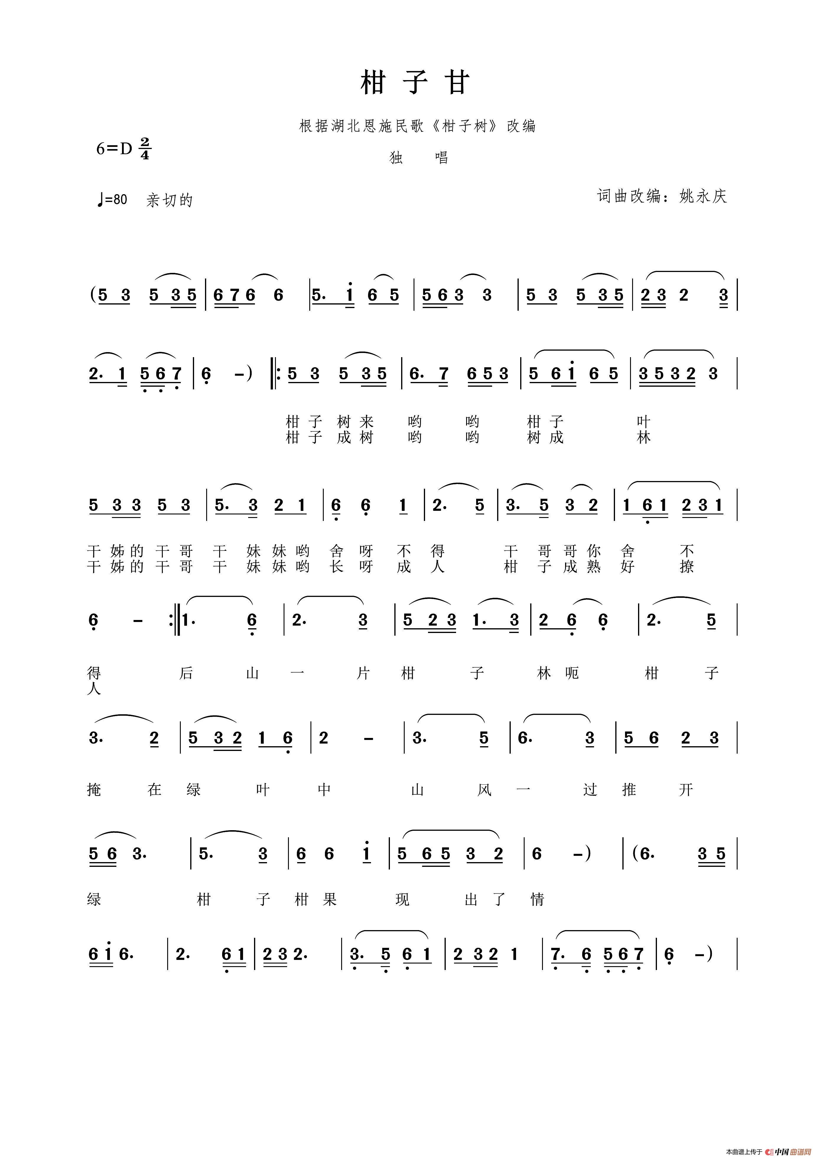 《柑子甘》是根据湖北民歌《柑子树》改编并创作的。本曲是三段式曲:ABA`,A段是根据原曲的变奏