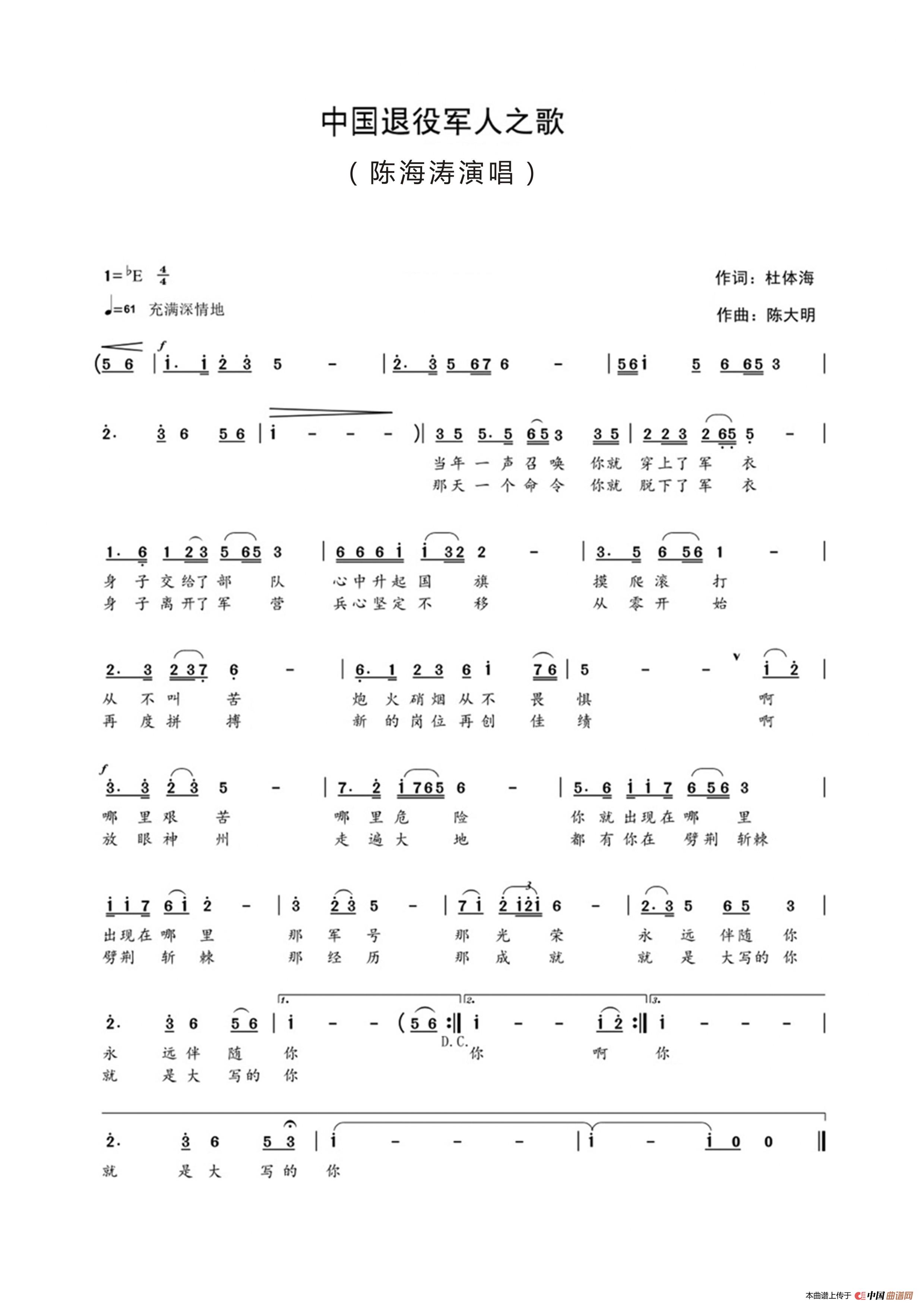 《中国退役军人之歌》由人民日报数字、陕西艺海涛声传媒联合出品,由原兰州军区炮兵第一旅政治部主任、济宁市广播电视局副局长杜体海作词,作曲家陈大明谱曲,歌唱家陈海涛演唱。歌曲以朴实的歌词、优美的旋律、深情大气的演唱,热情讴歌了退役军人在部队摸爬滚打、回到地方继续拼搏的兵心军魂,在广大退役军人中产生了热烈反响,深受广大听众的喜爱。