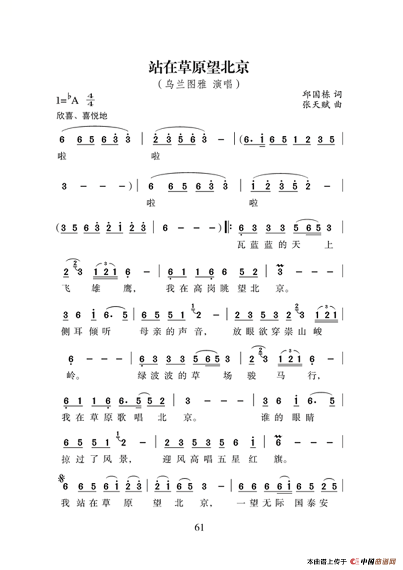 《站在草原望北京》 是乌兰图雅演唱的一首歌曲,由邱国栋作词,张天赋作曲,收录在乌兰图雅发行的专辑《醉美草原》中。2012年《站在草原望北京》MV获评央视优秀MV。