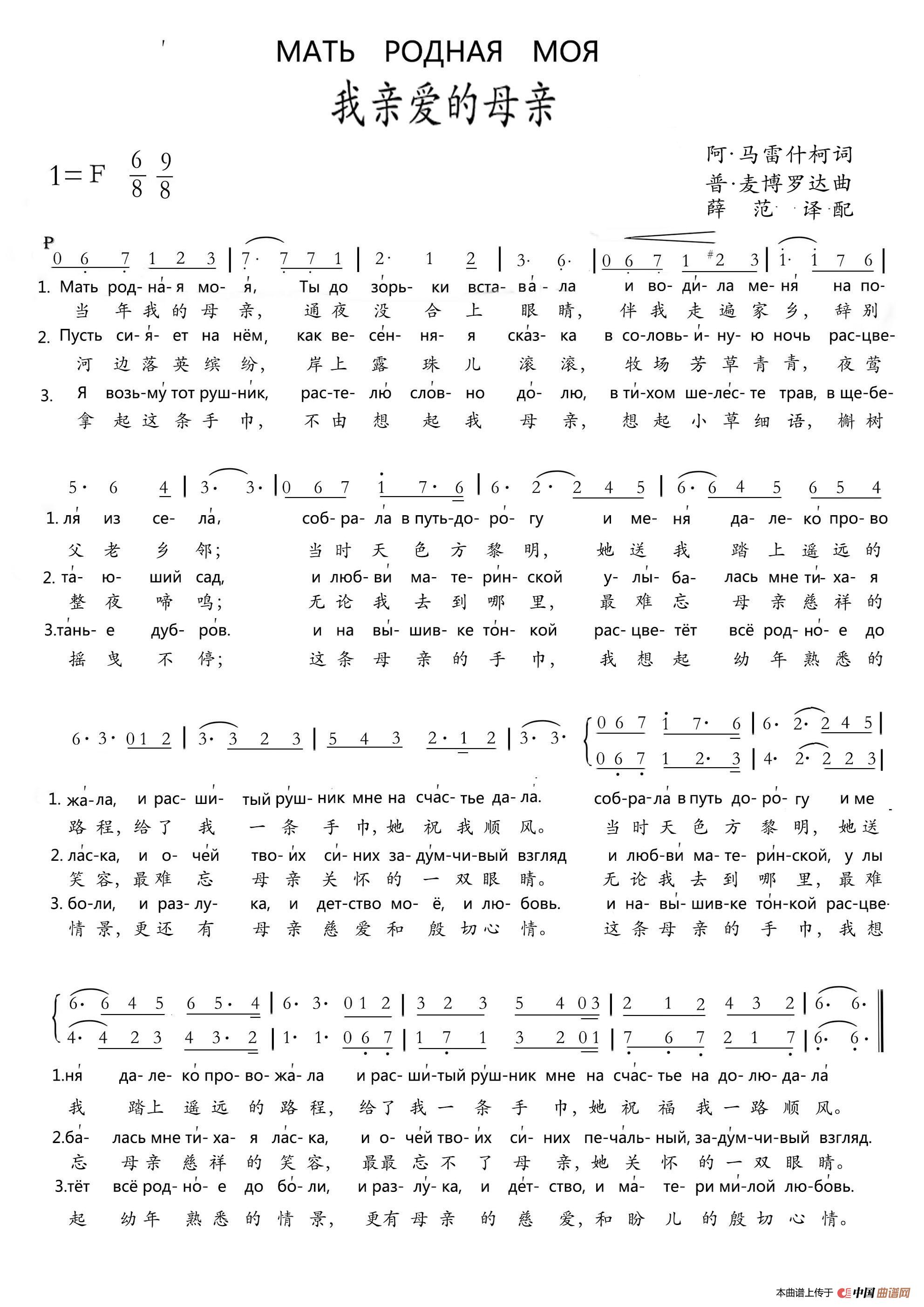 关于《МАТЬ РОДНАЯ МОЯ》曲谱的评论