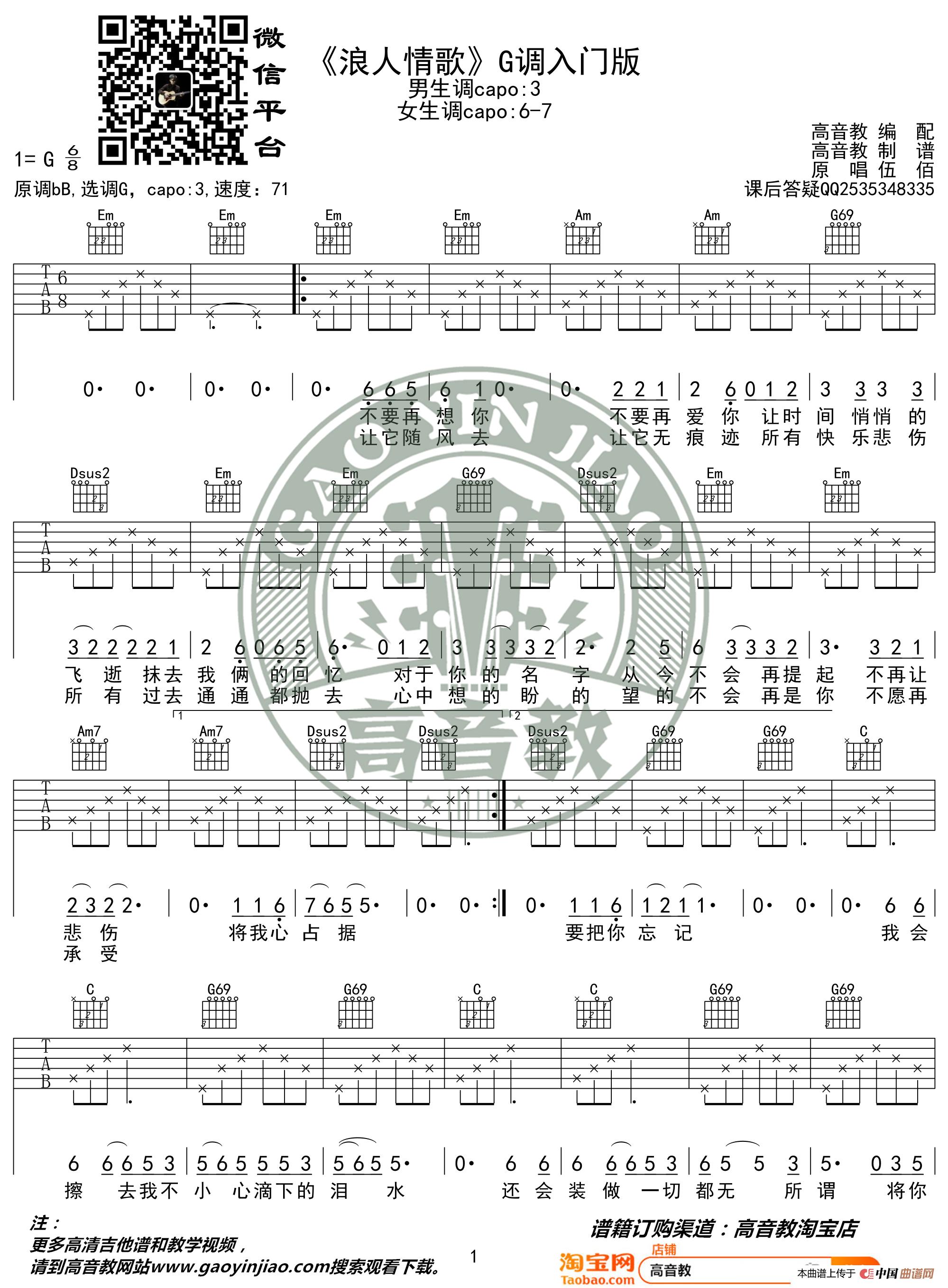 《浪人情歌》吉他谱吉他弹唱教学G调入门版 高音教