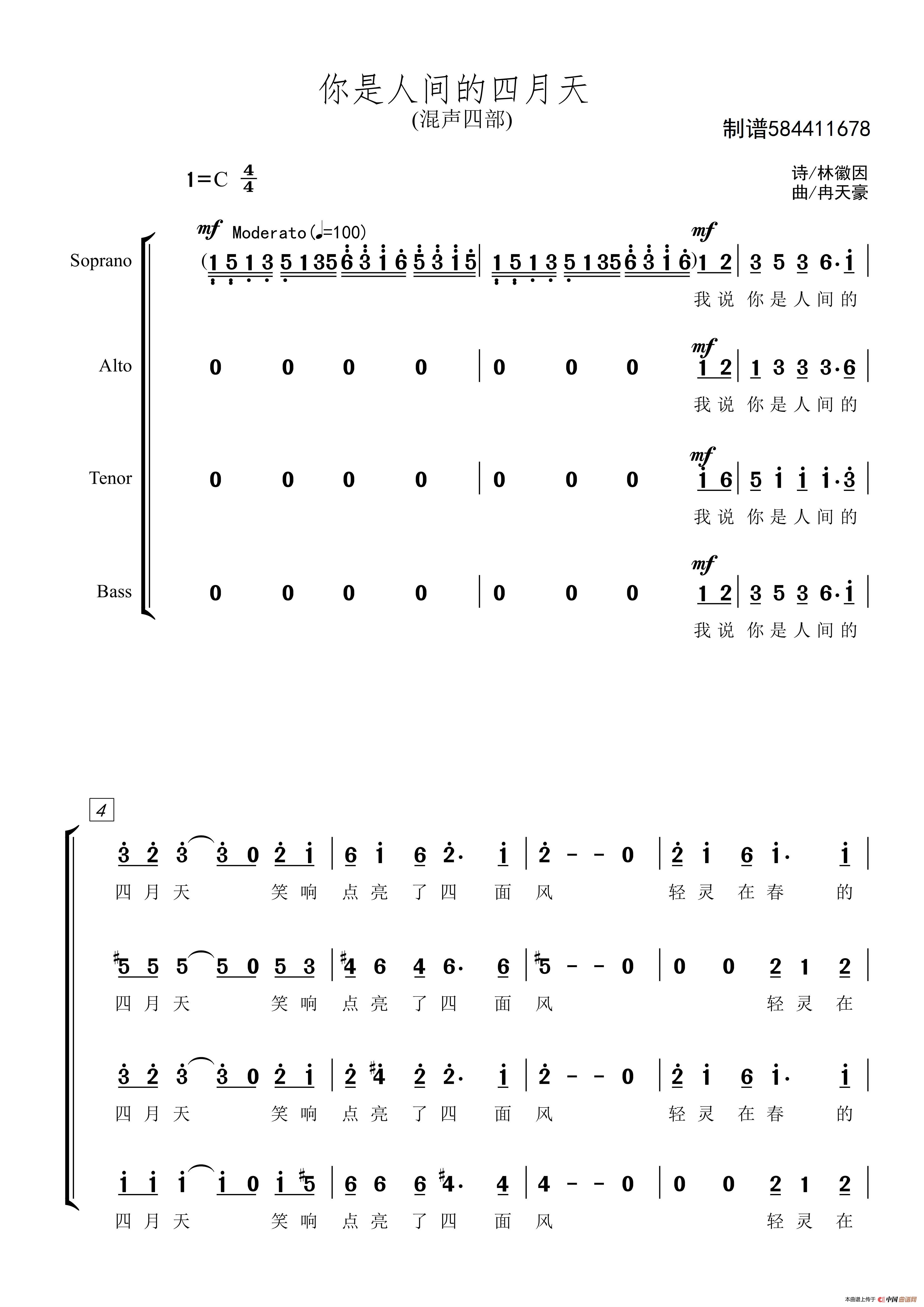 你是人间的四月天合唱谱