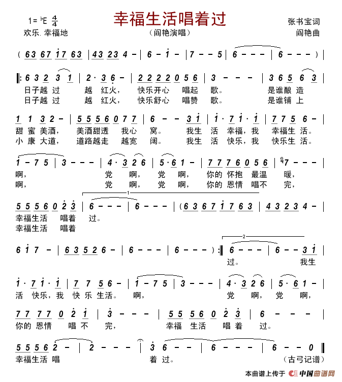 日子越过越红火,快乐开心唱起歌。是谁酿造甜蜜的美酒,美酒甜透我心窝。我生活幸福,我幸福生活。啊,党啊,党啊,你的怀抱最温暖,幸福生活唱着过。