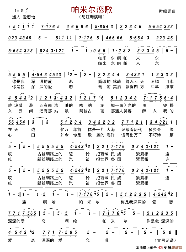 帕米尔啊帕米尔你是我深深的爱恋巍峨的冰峰耸入云天阿姆河水碧波潋滟还有那浩渺的喀纳湖如一面闪光的明镜掛在天边亿万年前你是一片大海记载着历代多少奇缘哎古丝绸路上的驼铃把西域民族紧紧相连哎古丝绸路上的驼铃把西域民族紧紧相连