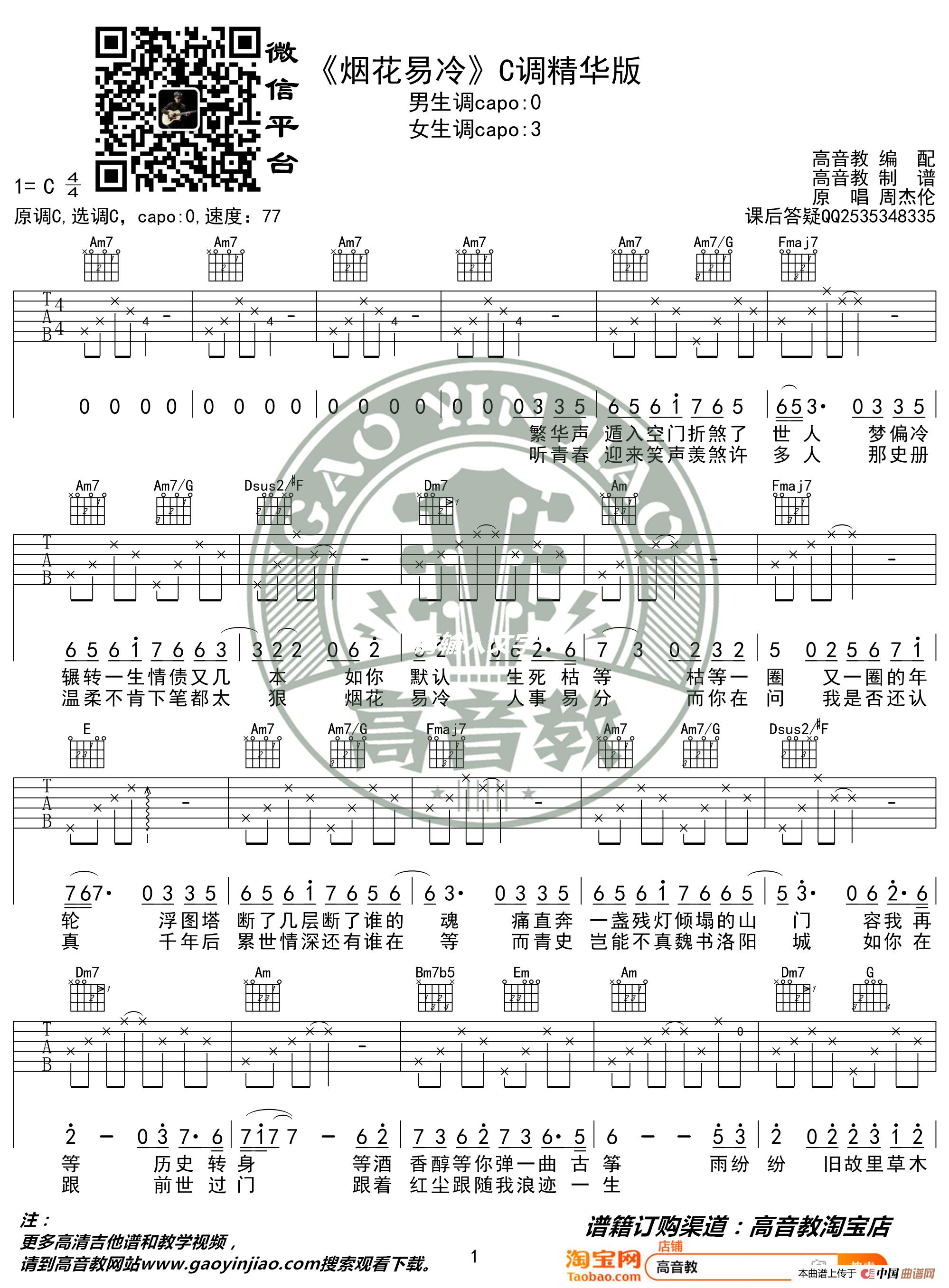 周杰伦《烟花易冷》吉他谱吉他弹唱教学C调精华版 高音教