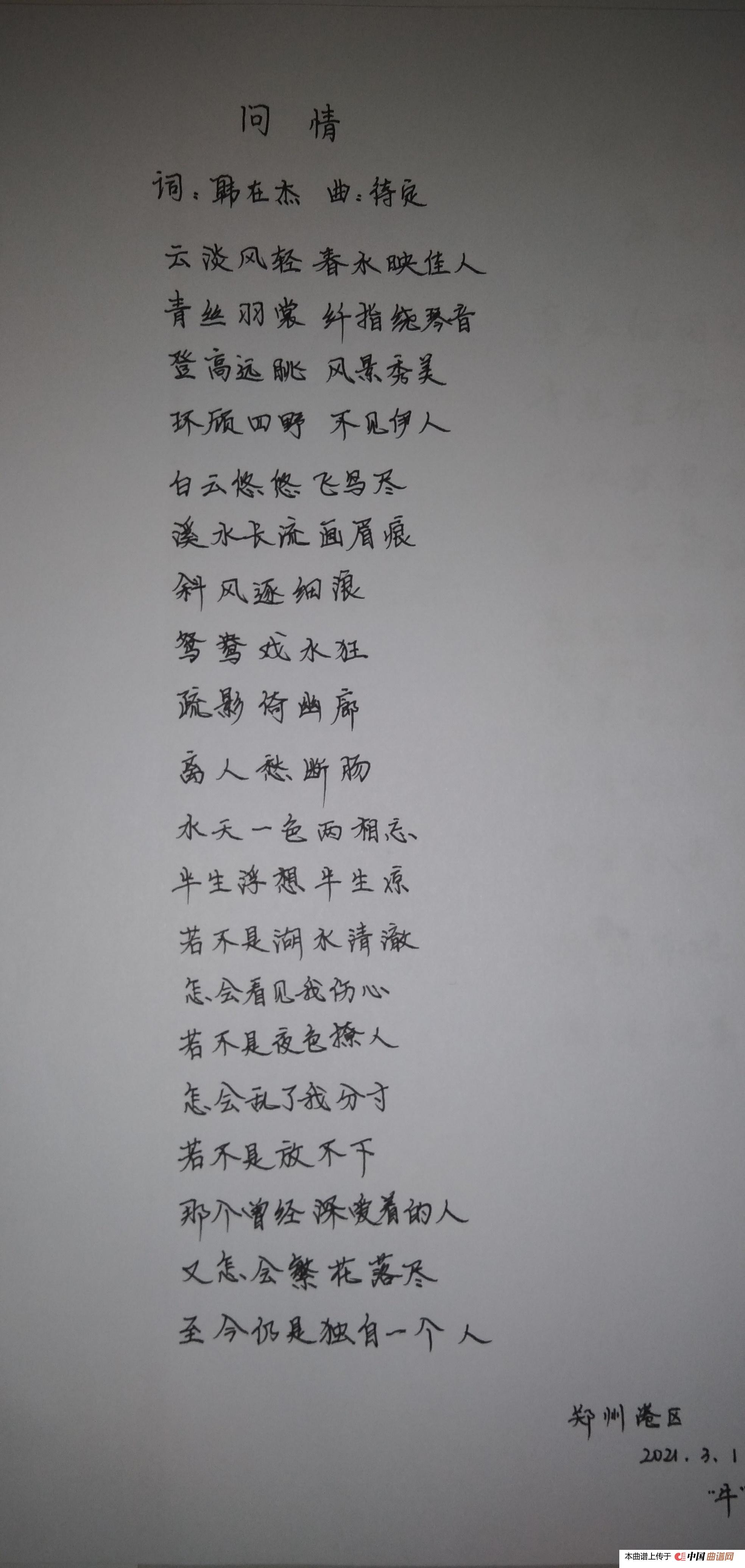 云淡风轻春水映佳人,青丝羽裳纤指绕琴音。登高远眺风景秀美,环顾四野不见伊人。白云走走飞鸟尽,溪水长流画眉痕。斜风逐细浪,鸳鸯溪水狂。疏影伊幽廊,离人愁断肠。水天一色两相忘,半生浮想半生凉。若不是湖水清澈,怎会看见我伤心;若不是夜色撩人,怎会乱了我分寸;若不是放不下,那个曾经深爱着的人,又怎会繁华落尽,至今仍是独自一个人!关于《问情》曲谱的评论