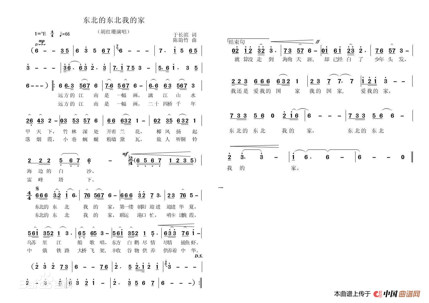 《东北的东北我的家》是一首民族美声风格的华语歌曲,作词 于长滨,作曲 陈韵竹,编曲 许曦,原唱 胡红珊。