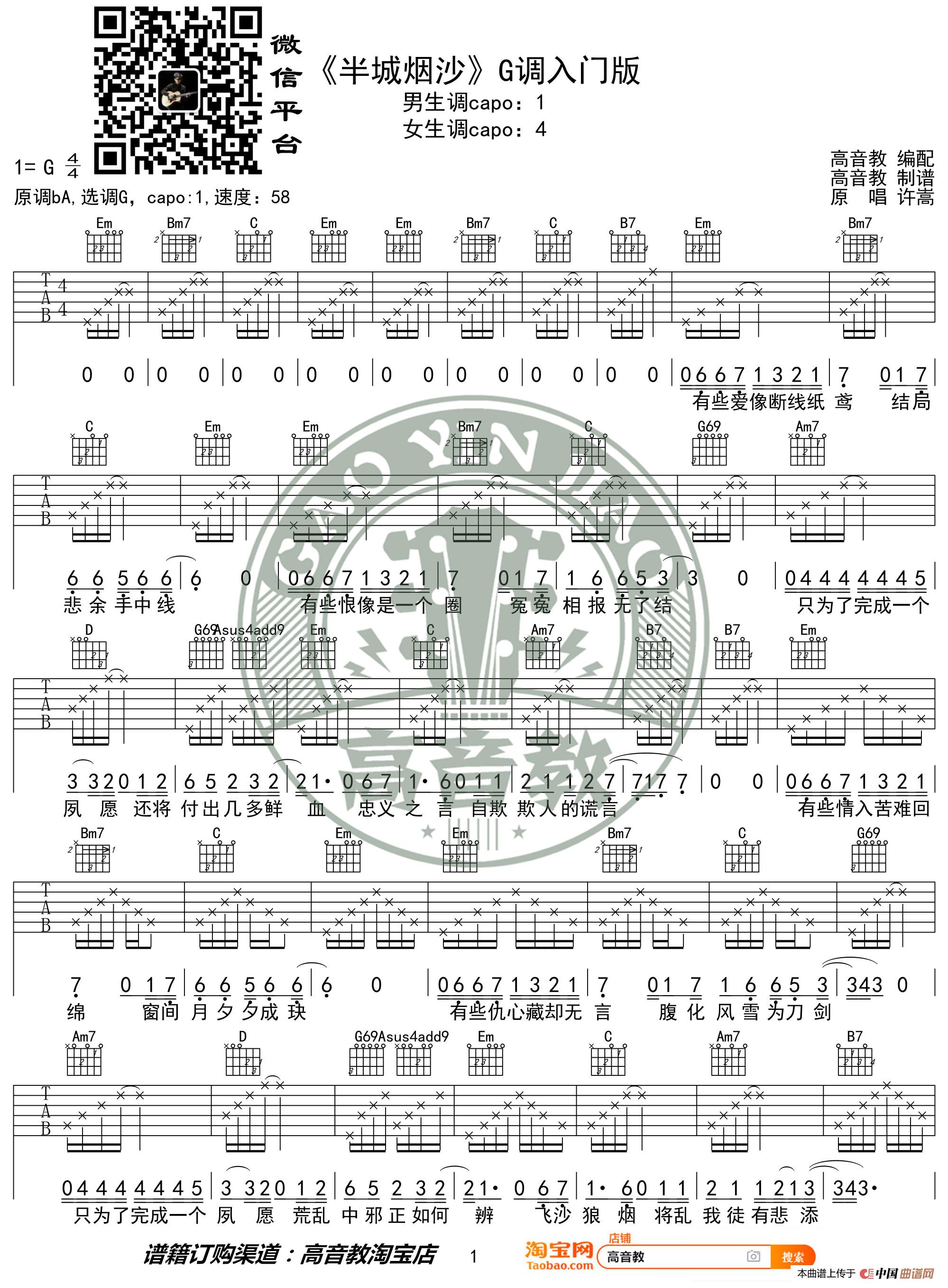 《半城烟沙》吉他谱吉他弹唱教学G调入门版 高音教
