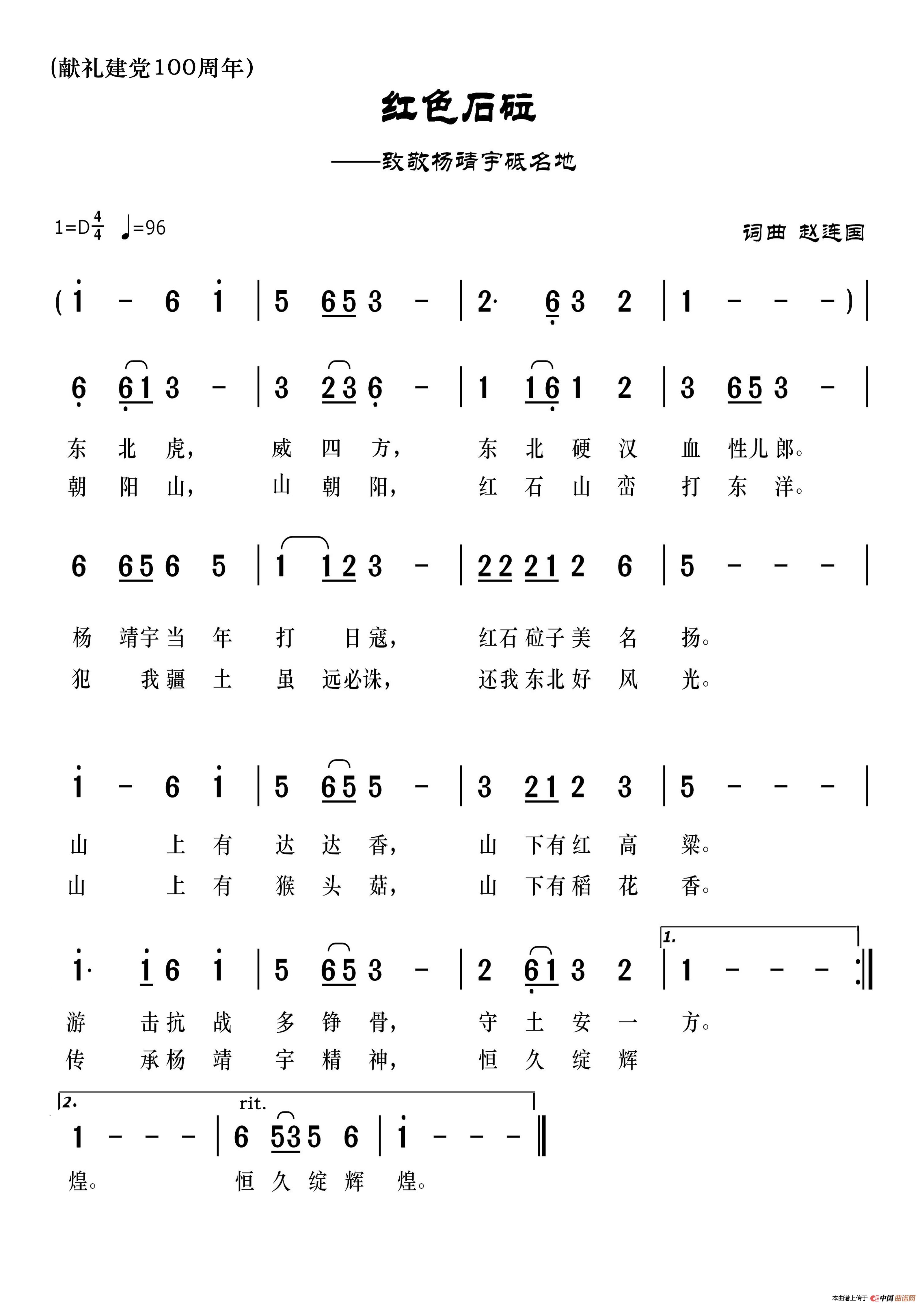 本歌曲为原创,为献礼建党100周年而作。颂扬红石砬子抗日根据地,及根据地的英雄人民;颂扬抗日英雄杨靖宇精神,及东北抗日联军精神。红石砬子山位于吉林省磐石市朝阳山镇域内,诞生了中国共产党领导的第一支东北抗日武装——磐石游击队,在杨靖宇将军领导下,发展壮大为东北抗日联军第一路军。
