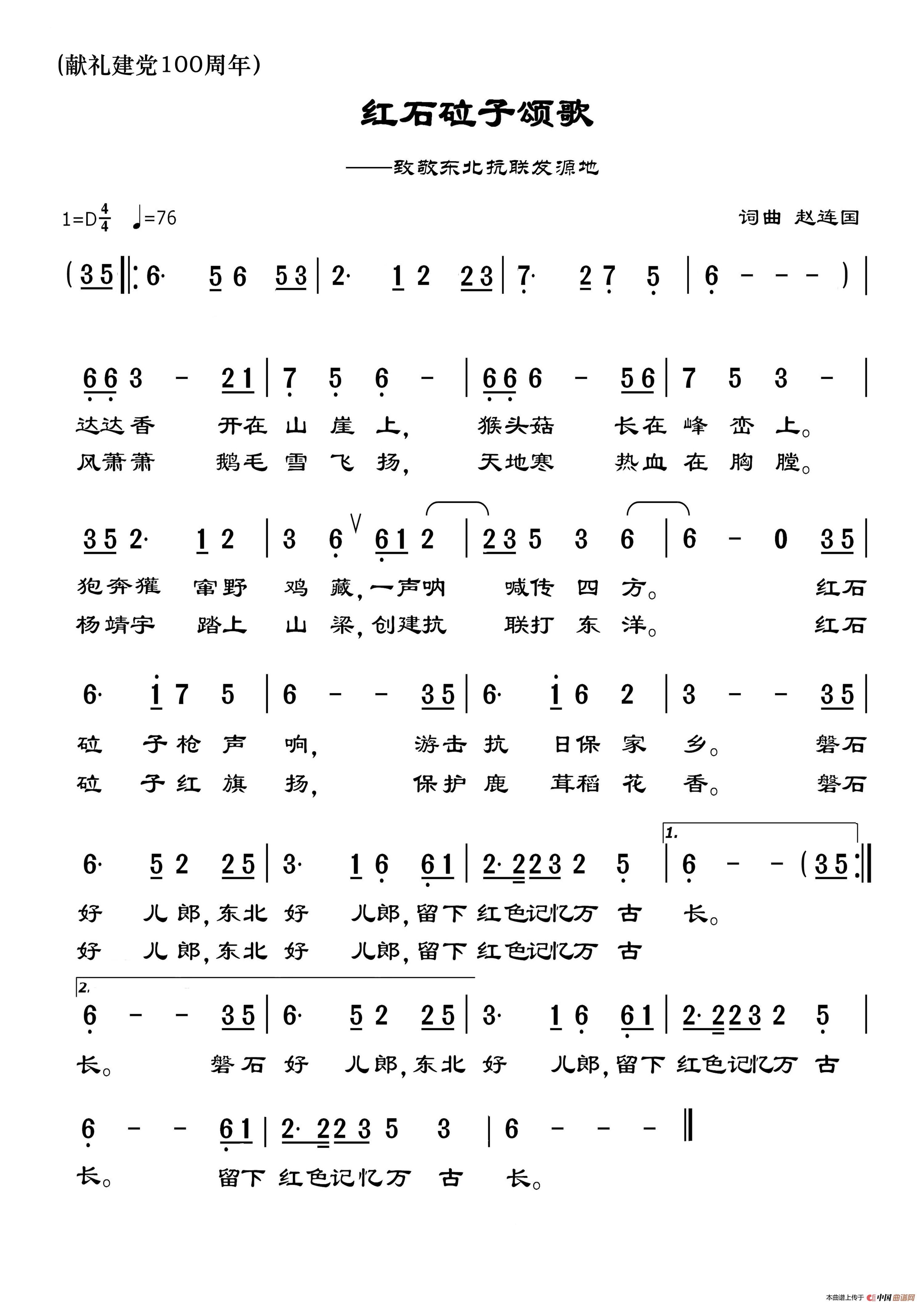 风萧萧鹅毛雪飞扬,天地寒热血在胸膛。杨靖宇踏上山梁,创建抗联打东洋。红石砬子红旗扬,保护鹿茸稻花香。磐石好儿郎,东北好儿郎,留下红色记忆万古长。磐石好儿郎,东北好儿郎,留下红色记忆万古长。留下红色记忆万古长。