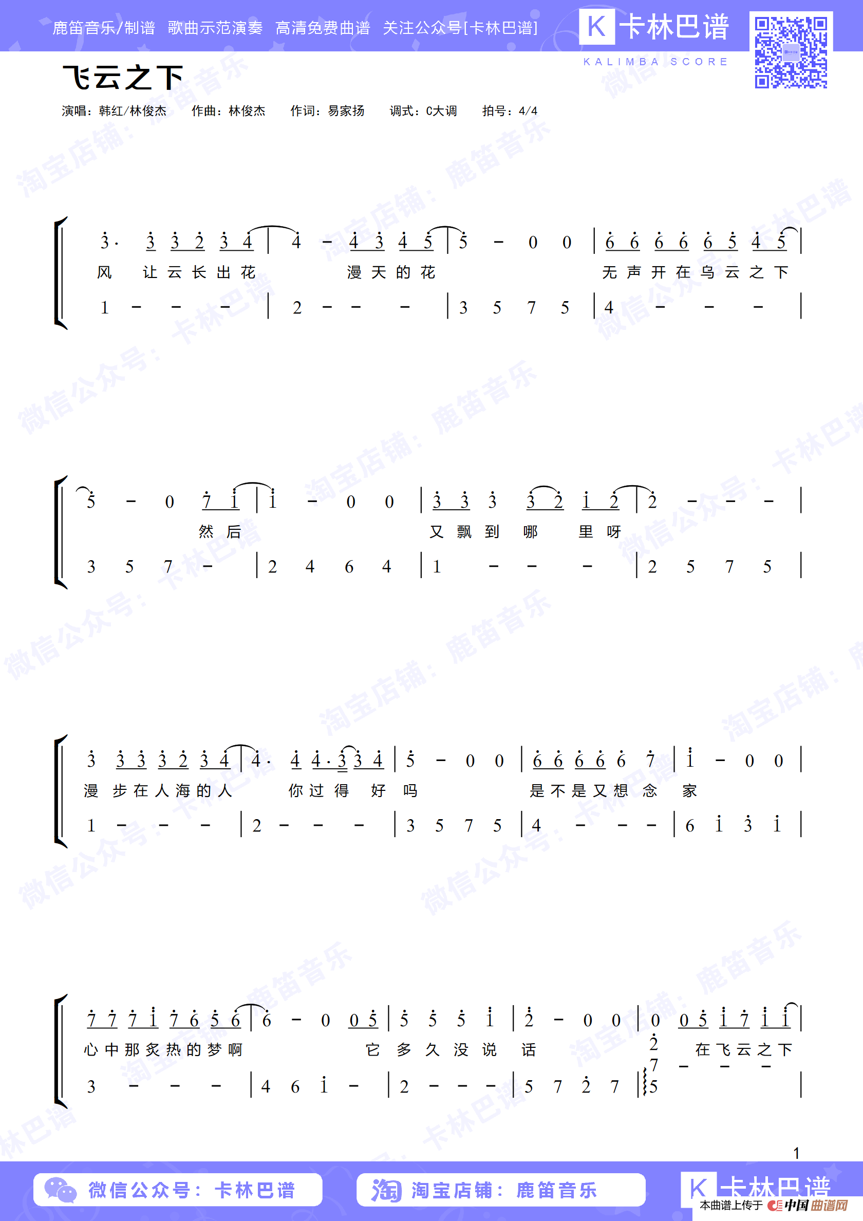 飞云之下(卡林巴拇指琴简谱)
