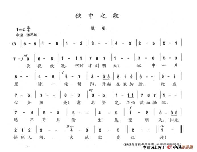 关于《狱中之歌》曲谱的评论