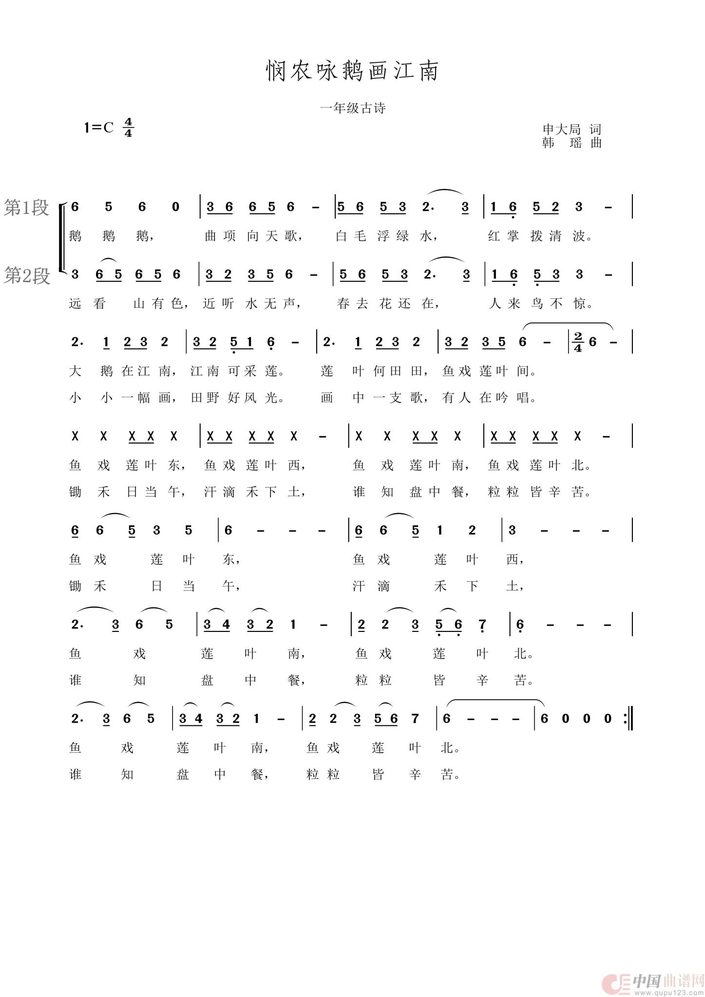 歌词由国家一级编剧申大局老师,依据小学古诗词,将悯农、咏鹅、江南三首有机的串联起来,便于学生们通过歌唱的形式记忆。关于《悯农咏鹅画江南》曲谱的评论