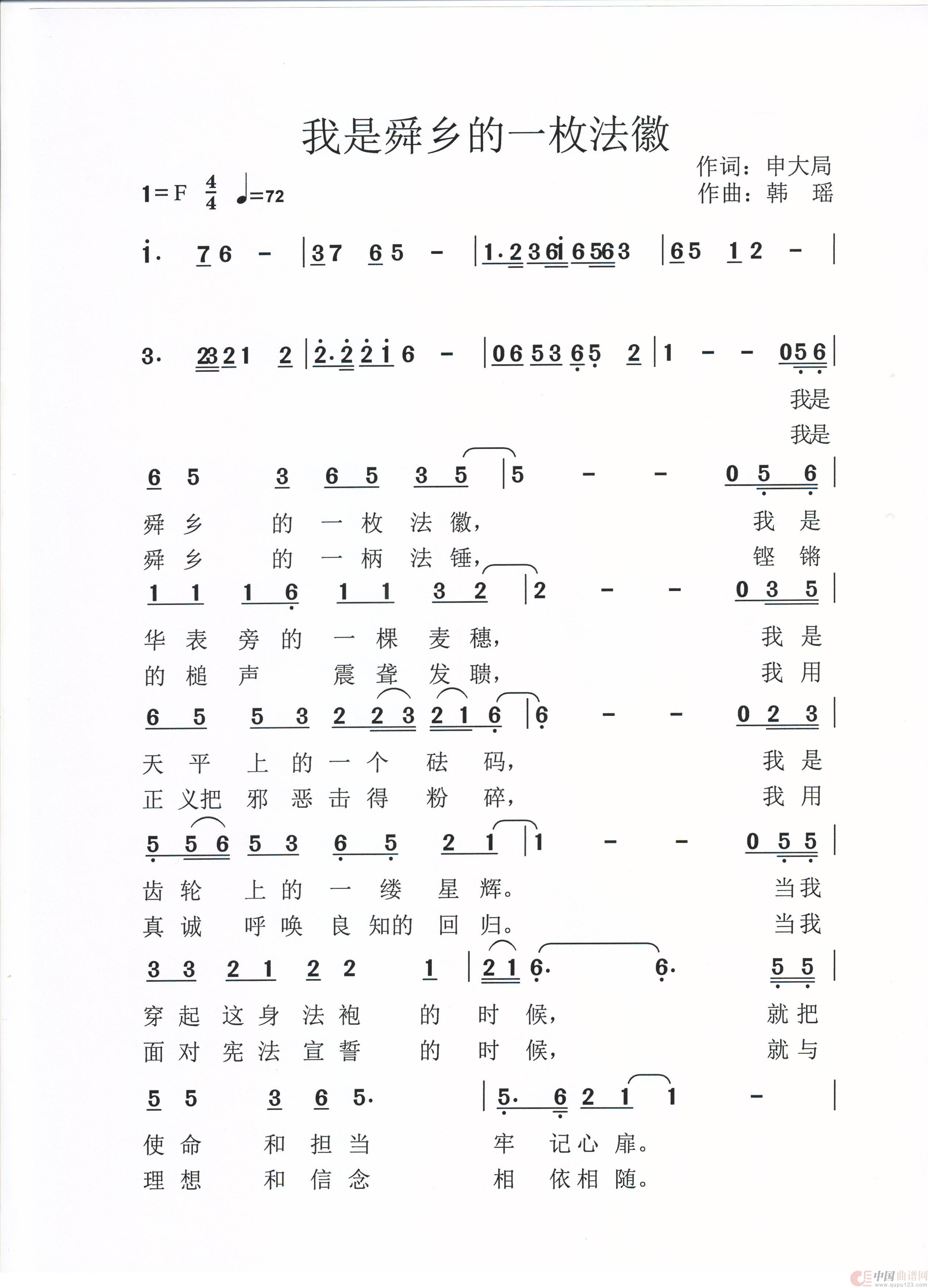 垣曲县,古称“舜乡”。应垣曲县人民法院而作。关于《我是舜乡的一枚法徽》曲谱的评论